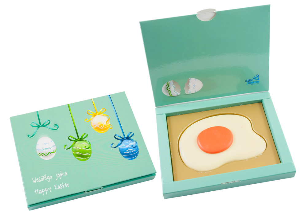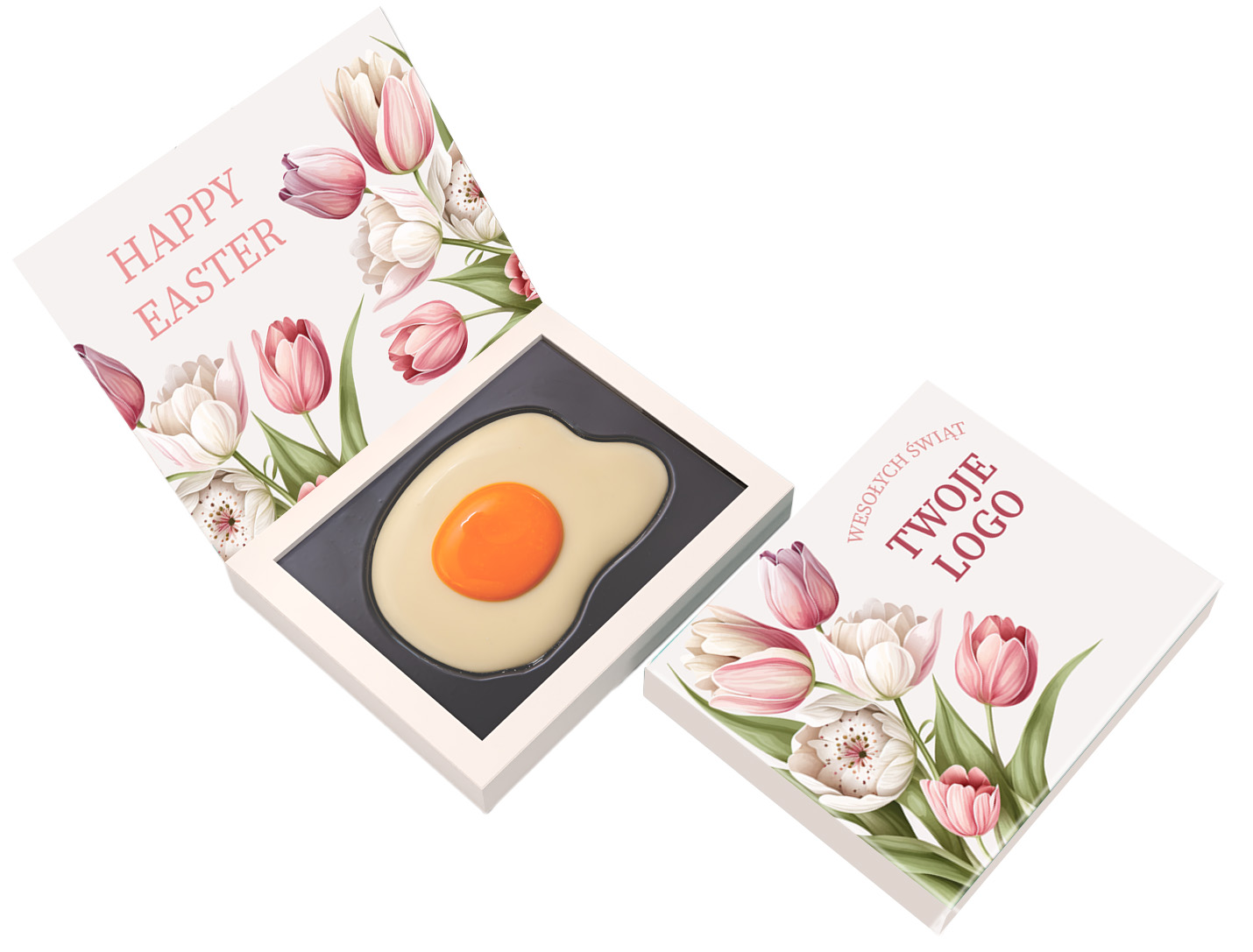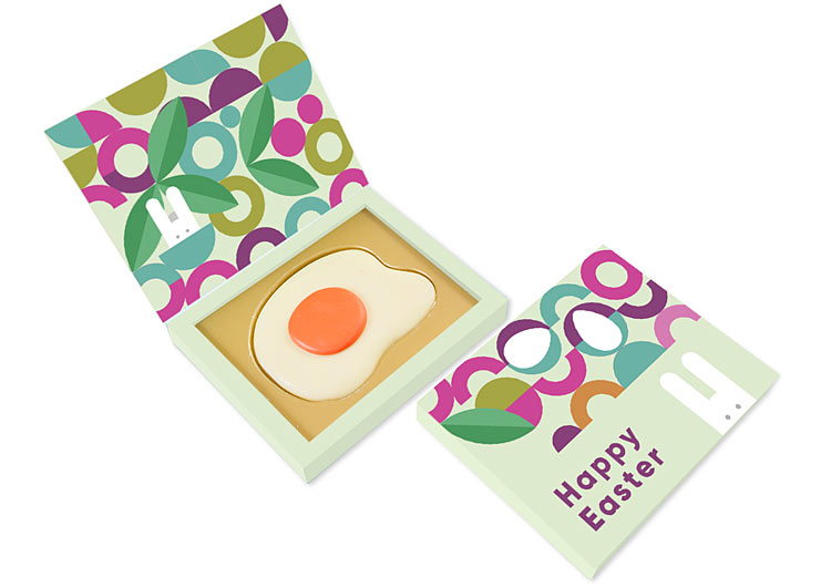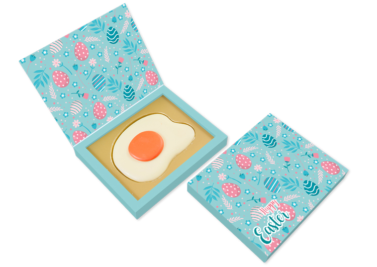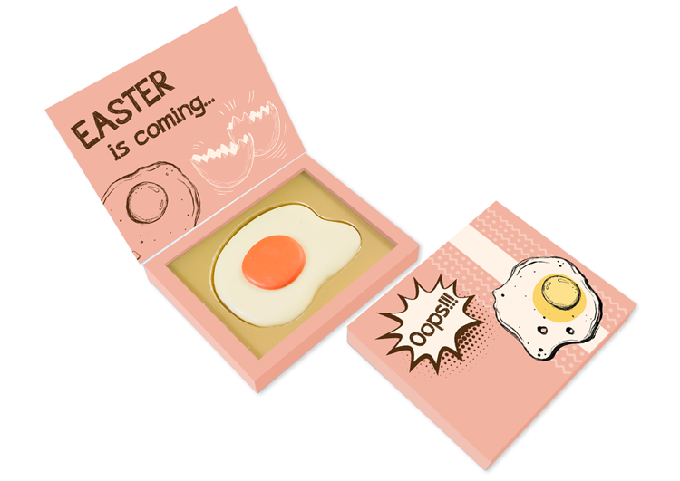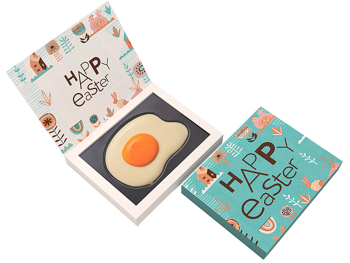 • hand-made fried eggs created using white and orange Belgian chocolate