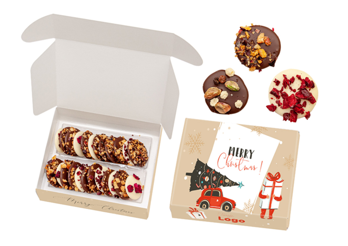 - luxurious set containing 24 milk or white chocolate slices decorated with various freeze-dried fruits, nuts or chocolate sprinkles