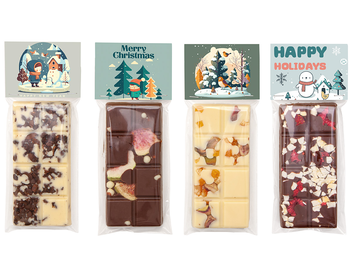 available types: white chocolate with crushed coffee; milk chocolate 44% cocoa with freeze-dried fig and chocolate balls; white chocolate with candied orange and pistachios; milk chocolate 44% cocoa with freeze-dried apple and raspberry