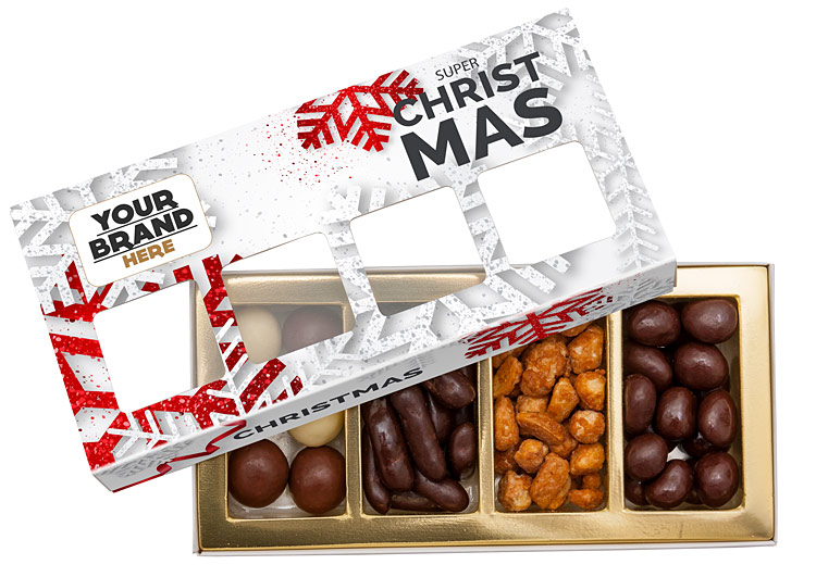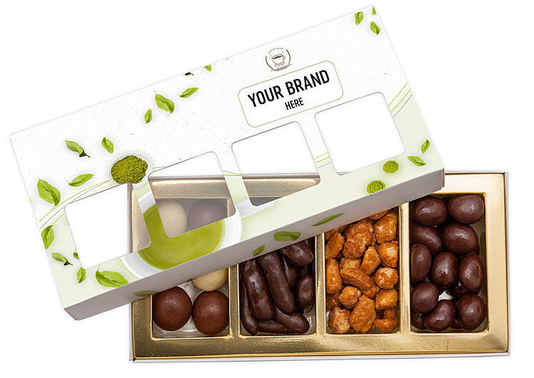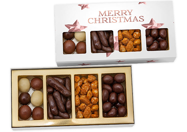 - 4 types of delicacies placed on gold or silver tray inside a cardboard box