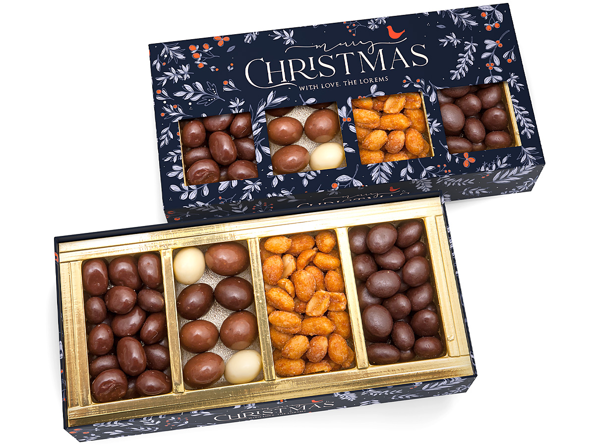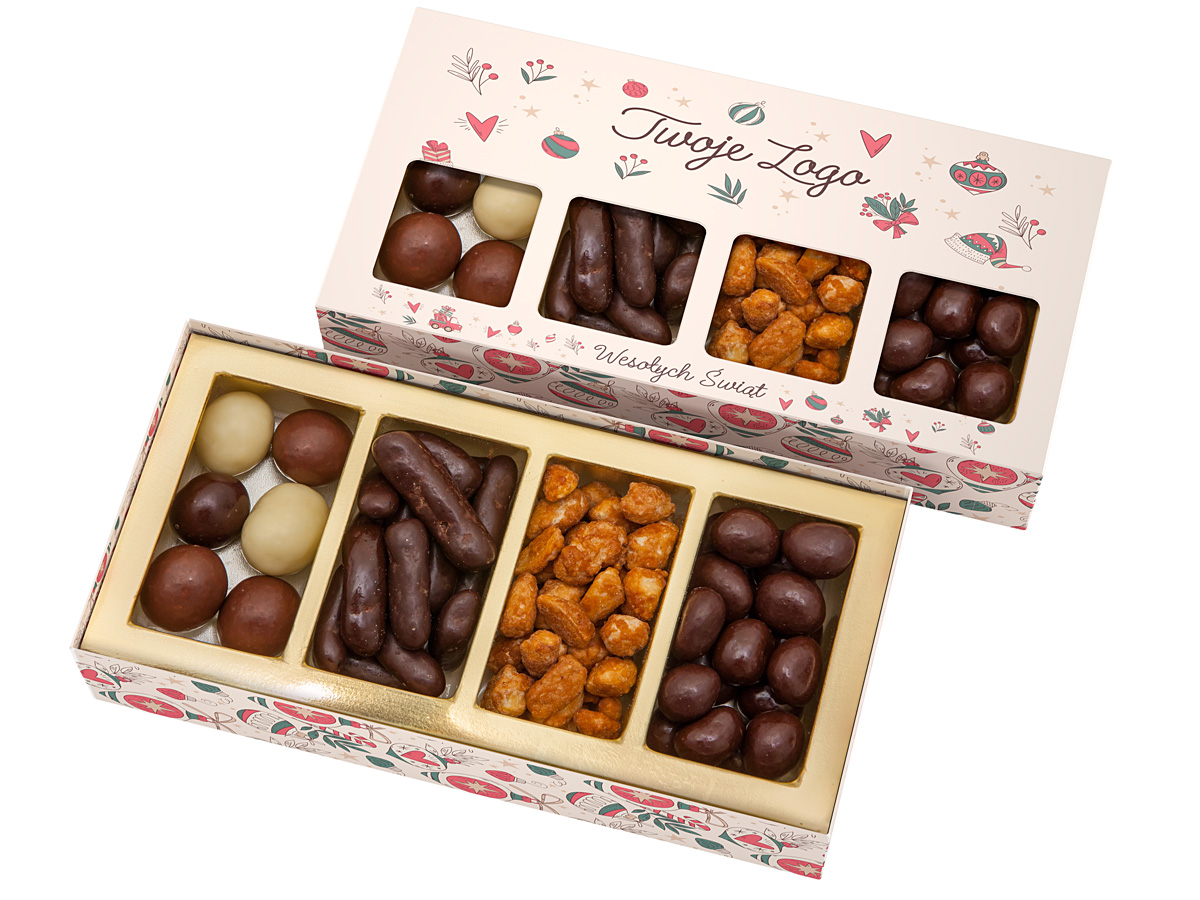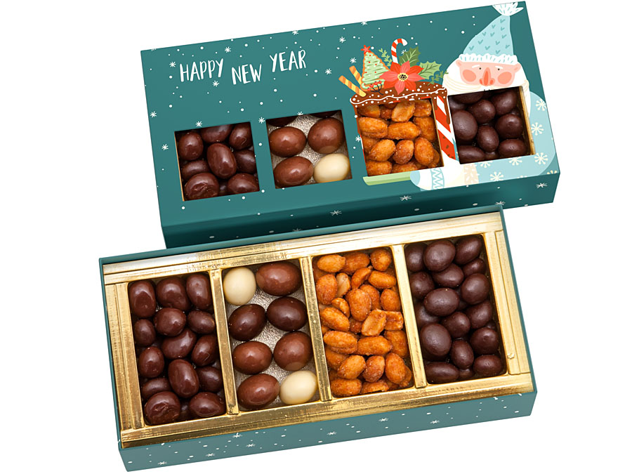- each set contains: almonds in chocolate (mix of white, milk and dark chocolate); dried cranberry in dessert chocolate; peanuts in caramel; orange peel in dessert chocolate