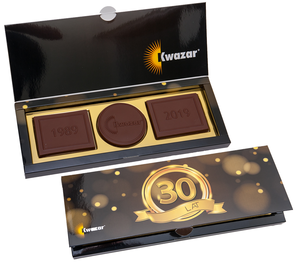 - two rectangular chocolates with establishing year and current year embossed directly on the chocolate and round chocolae with embossed company logo or other text of motif