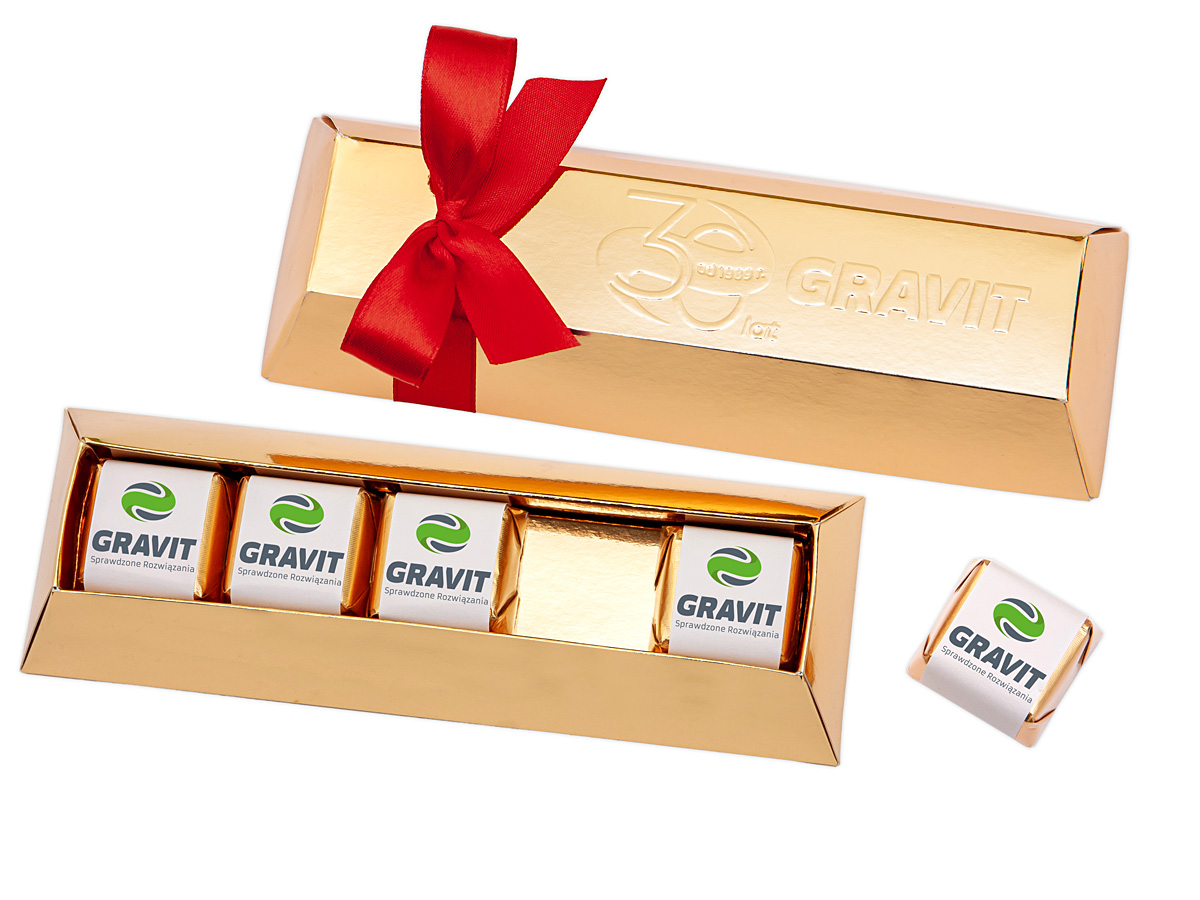 - 5 chocolates with delicate alcoholized cream filling wrapped in gold laminate and paper labels with promotional print.