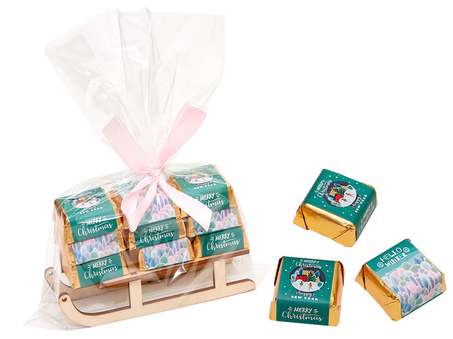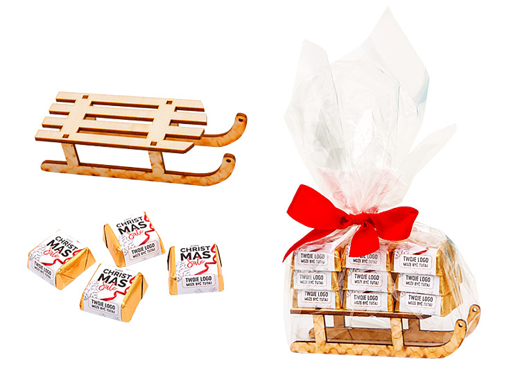 • czekoladki ułożone na ozdobnych saniach ze sklejki