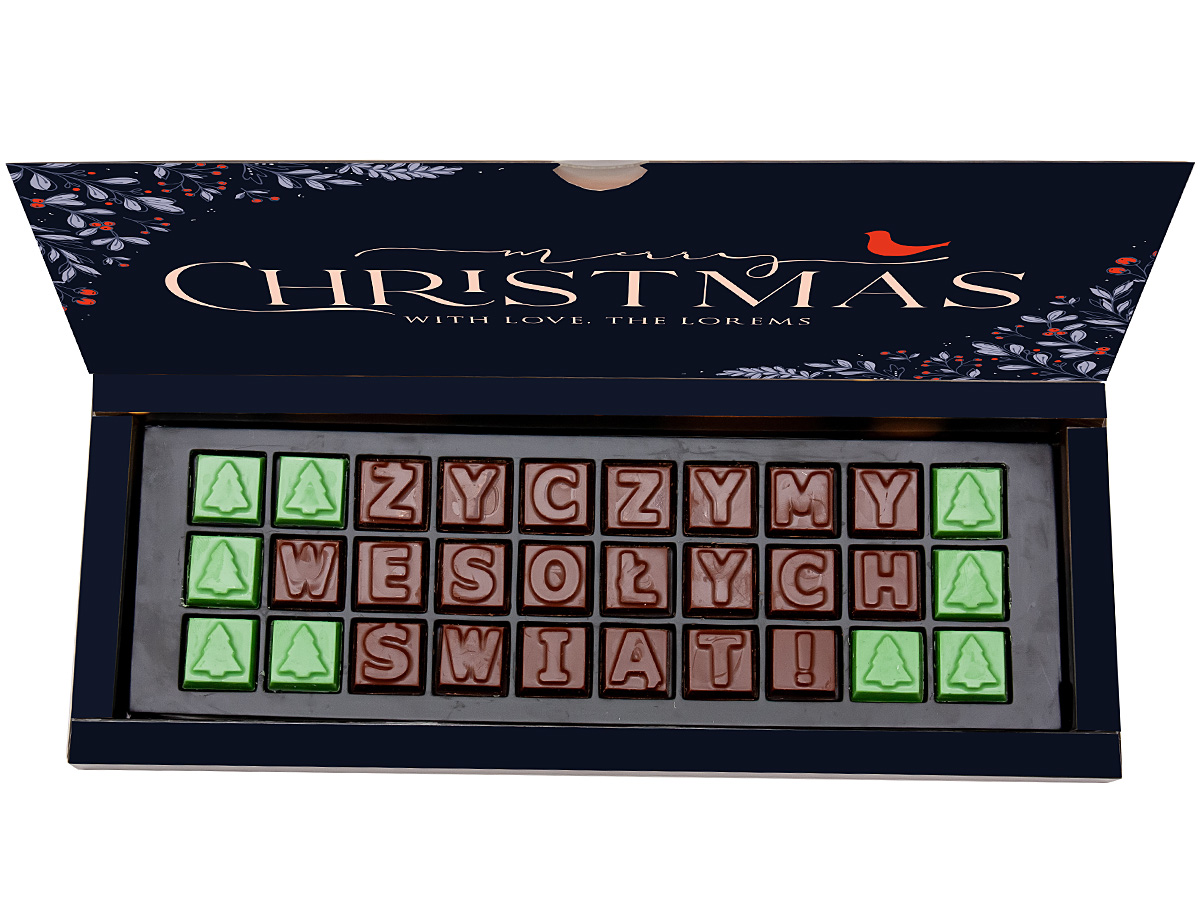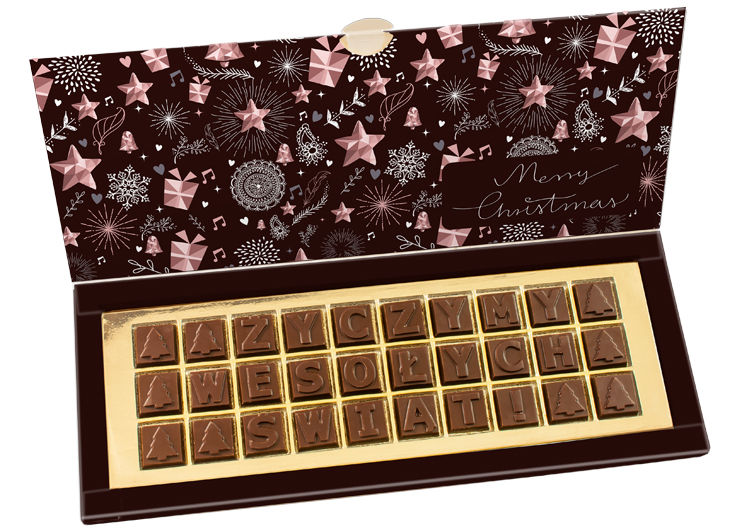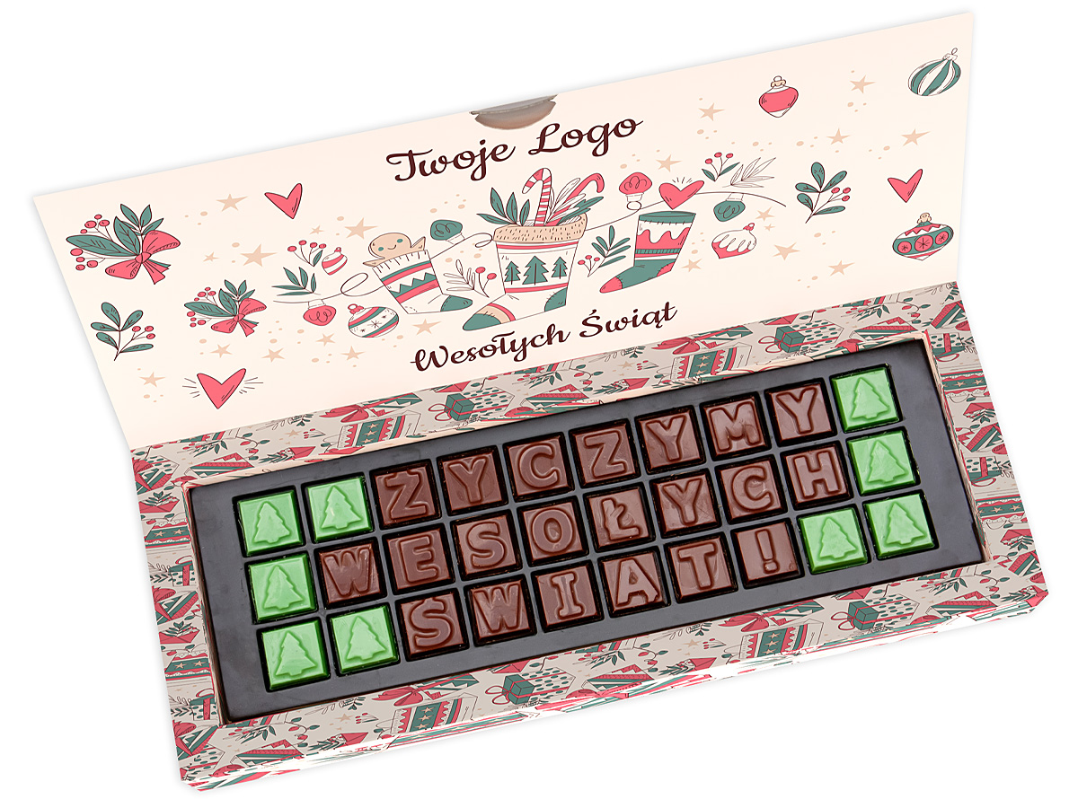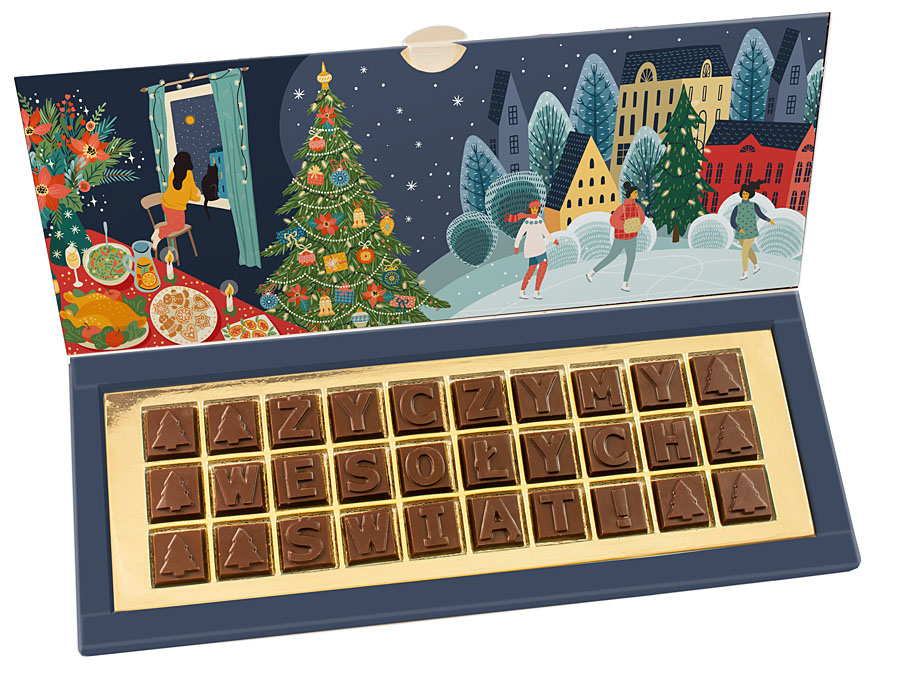 - available variants: milk chocolate 44% cocoa, white chocolate; in both cases chocolate with Chrismtas tree motif made of white chocolate coloured in green