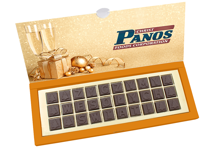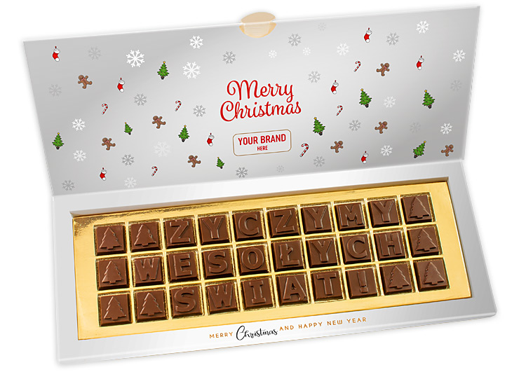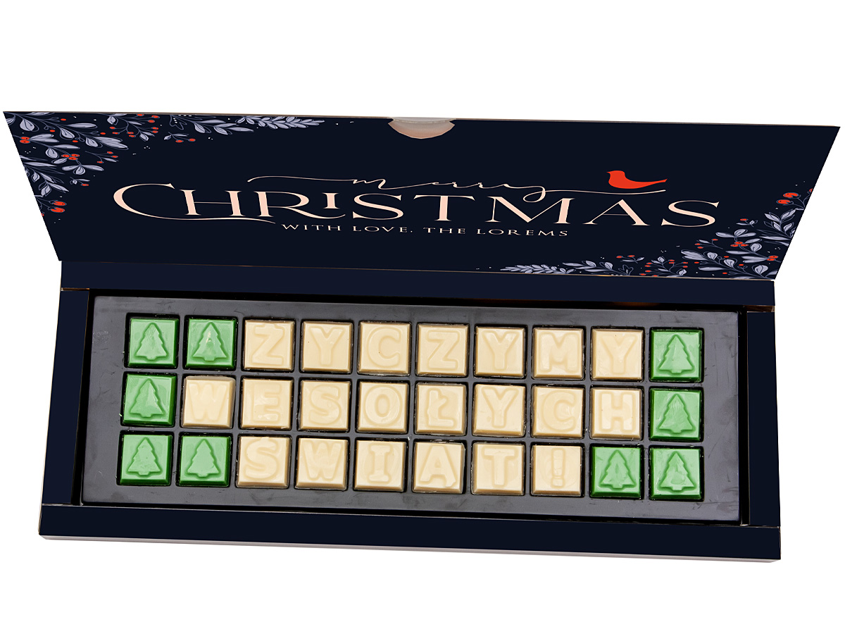 - Seasonal greetings made of squares with letters and Christmas tree symbol, made of Belgian chocolate