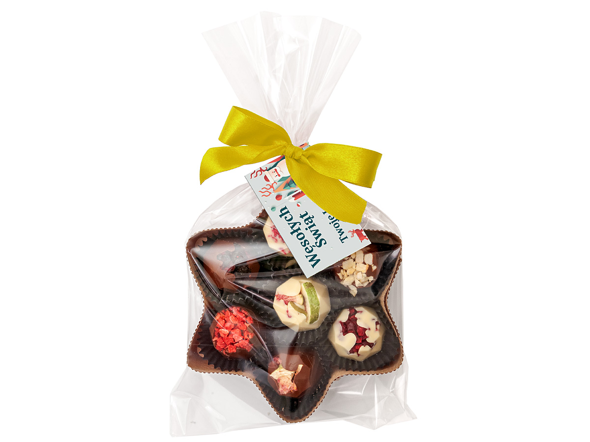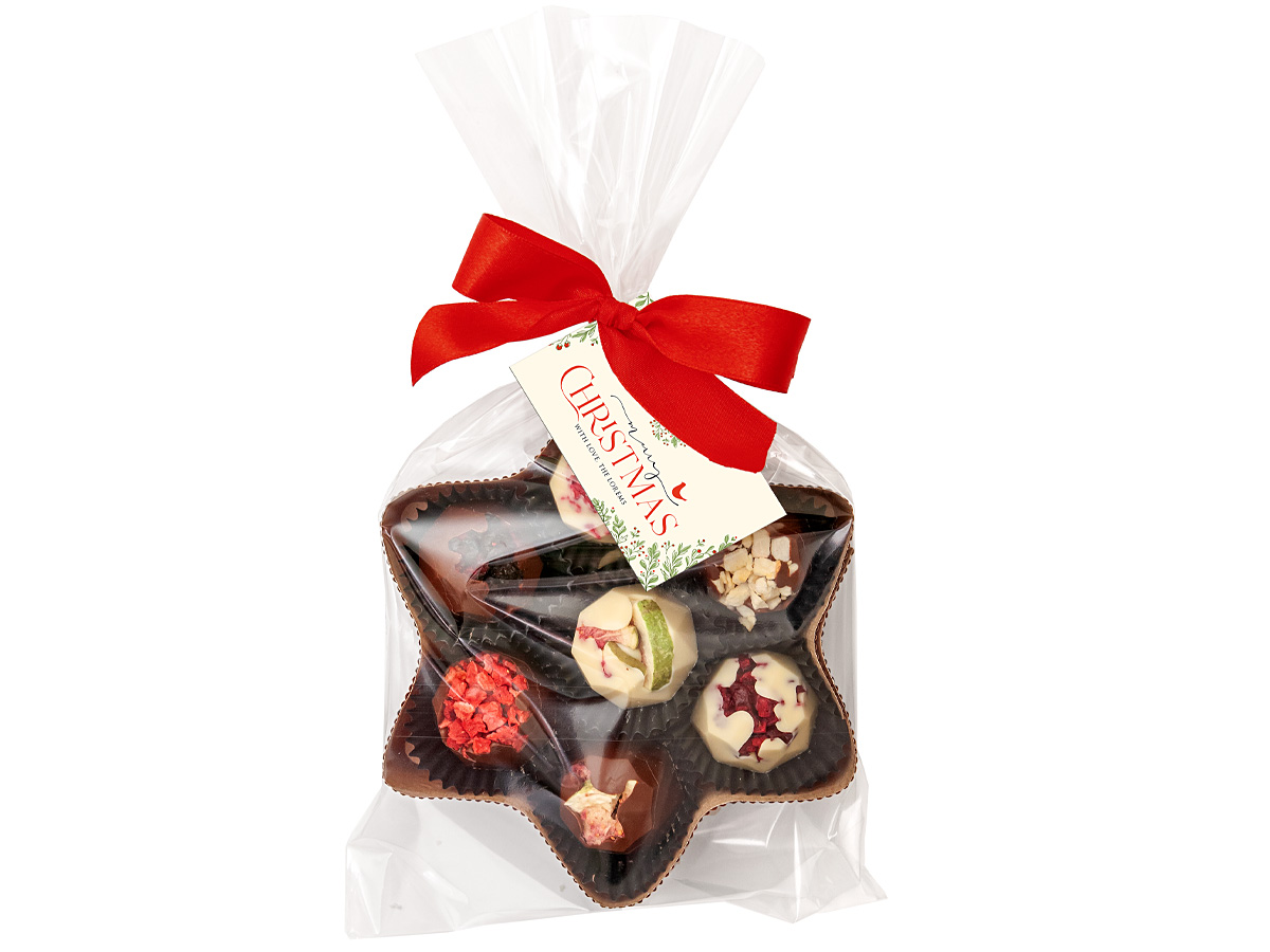 - 7 hand made milk (44% cocoa) or white chocolates with mix of freeze-dried fruits dipped inside