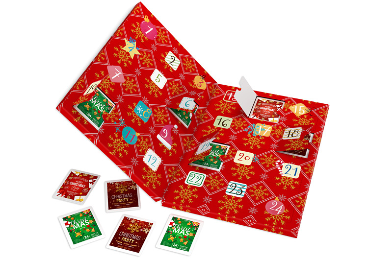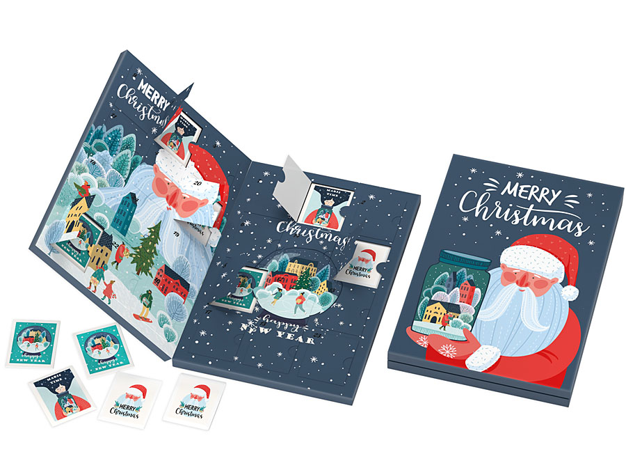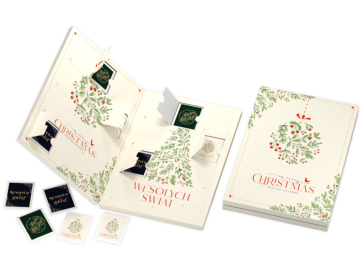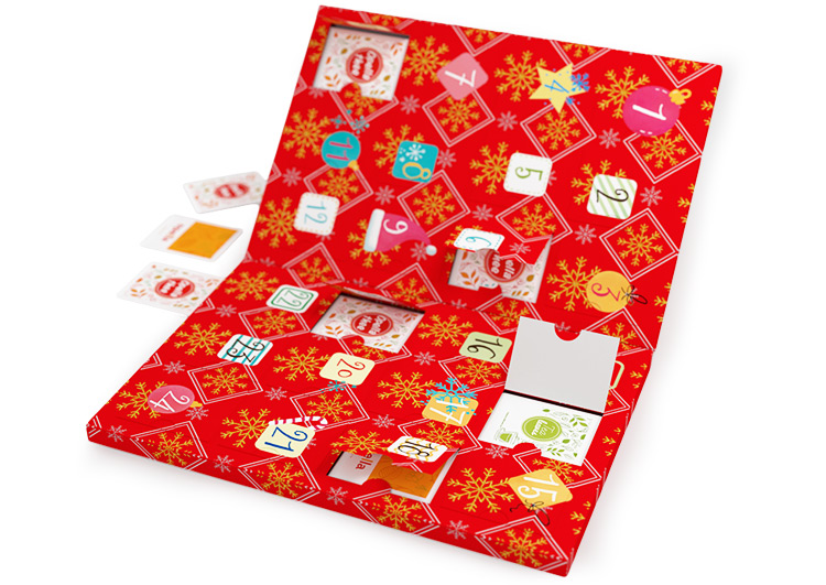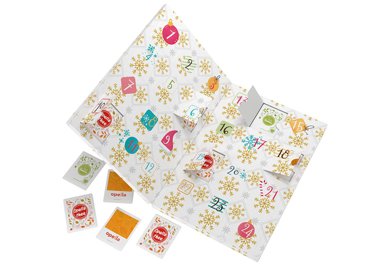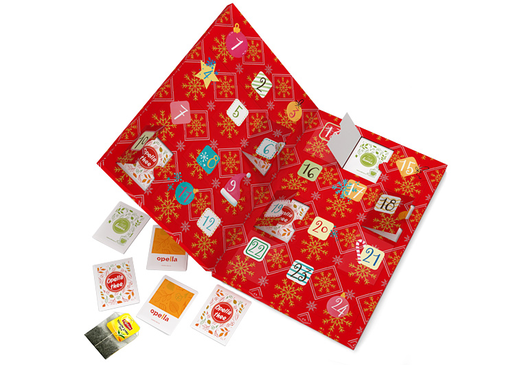 - astonishing book-shaped advent calendar with numbered windows through which tea bags are removed