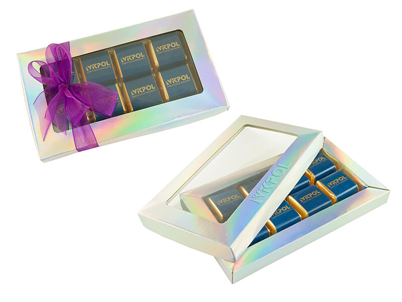 • każda czekoladka zawinięta w złoty laminat i obwolutę z dowolnym nadrukiem reklamowym CMYK na całej powierzchni opakowania