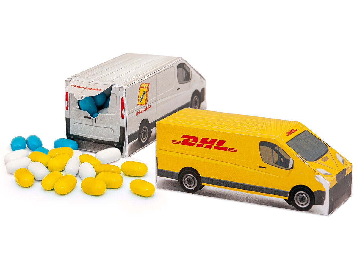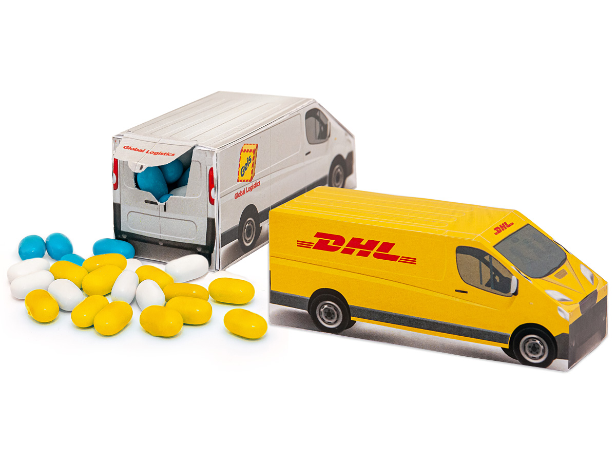 • oryginalne opakowanie w kształcie samochodu dostawczego wypełnione kolorowymi drażetkami miętowymi lub owocowymi