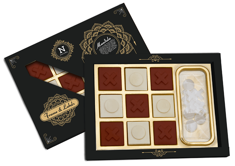 • oryginalna bombonierka zawierająca 9 czekoladek z motywem kultowej gry „kółko i krzyżyk”
