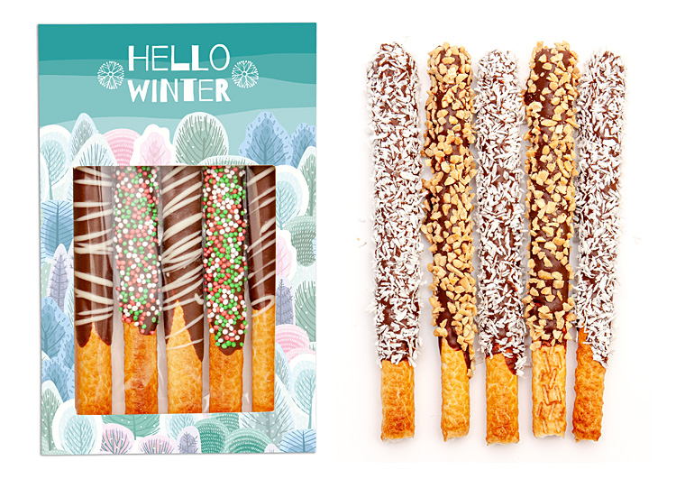 - I wariant: 3 paluchy ozdobione biała czekoladą + 2 paluchy obtoczone kolorową posypką; II wariant: 3 paluchy obtoczone w wiórkach kokosowych + 2 paluchy obtoczone w rozdrobionych orzechach ziemnych z dodatkiem soli