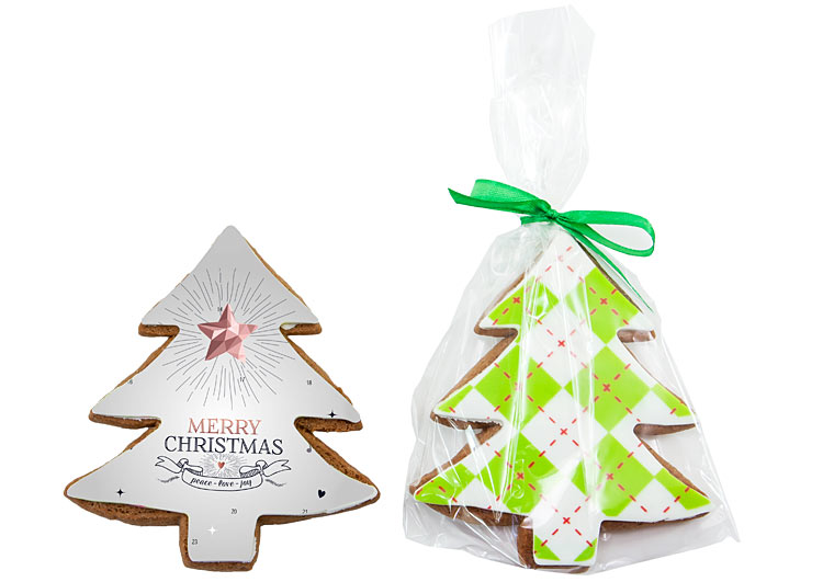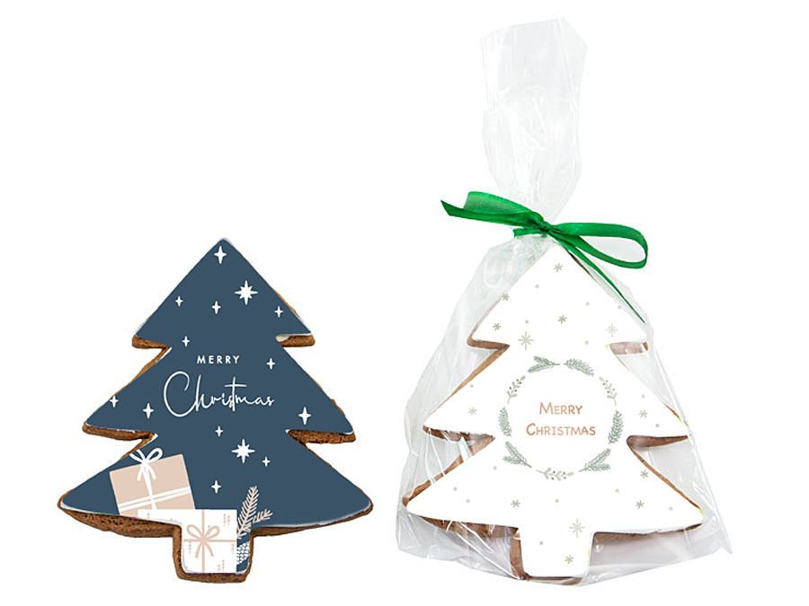 • ciastko w kształcie choinki pokryte jadalną masą cukrową z dowolnym nadrukiem reklamowym CMYK