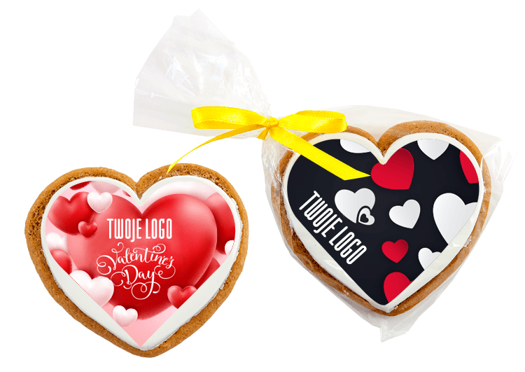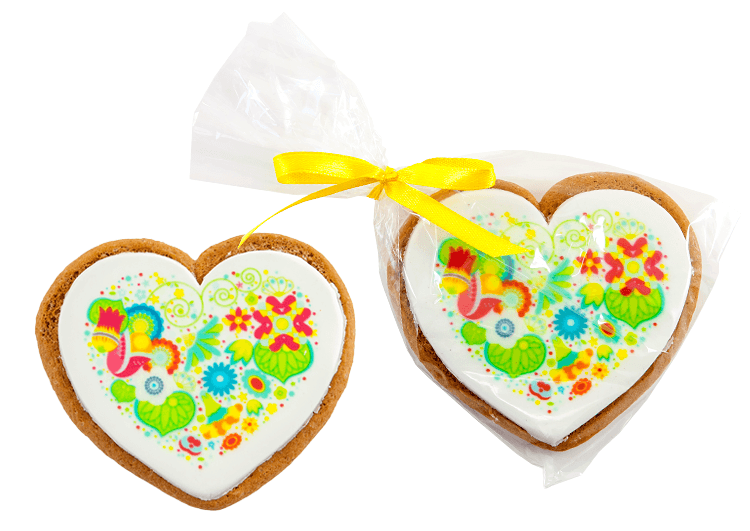 • miodowe ciastko w kształcie serca, pokryte masą cukrową z dowolnym nadrukiem reklamowym CMYK