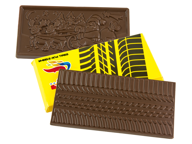 Czekolady mleczne 44% z wytłoczonym na jej powierzchni motywem wskazanym przez zamawiającego.