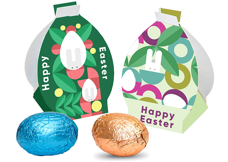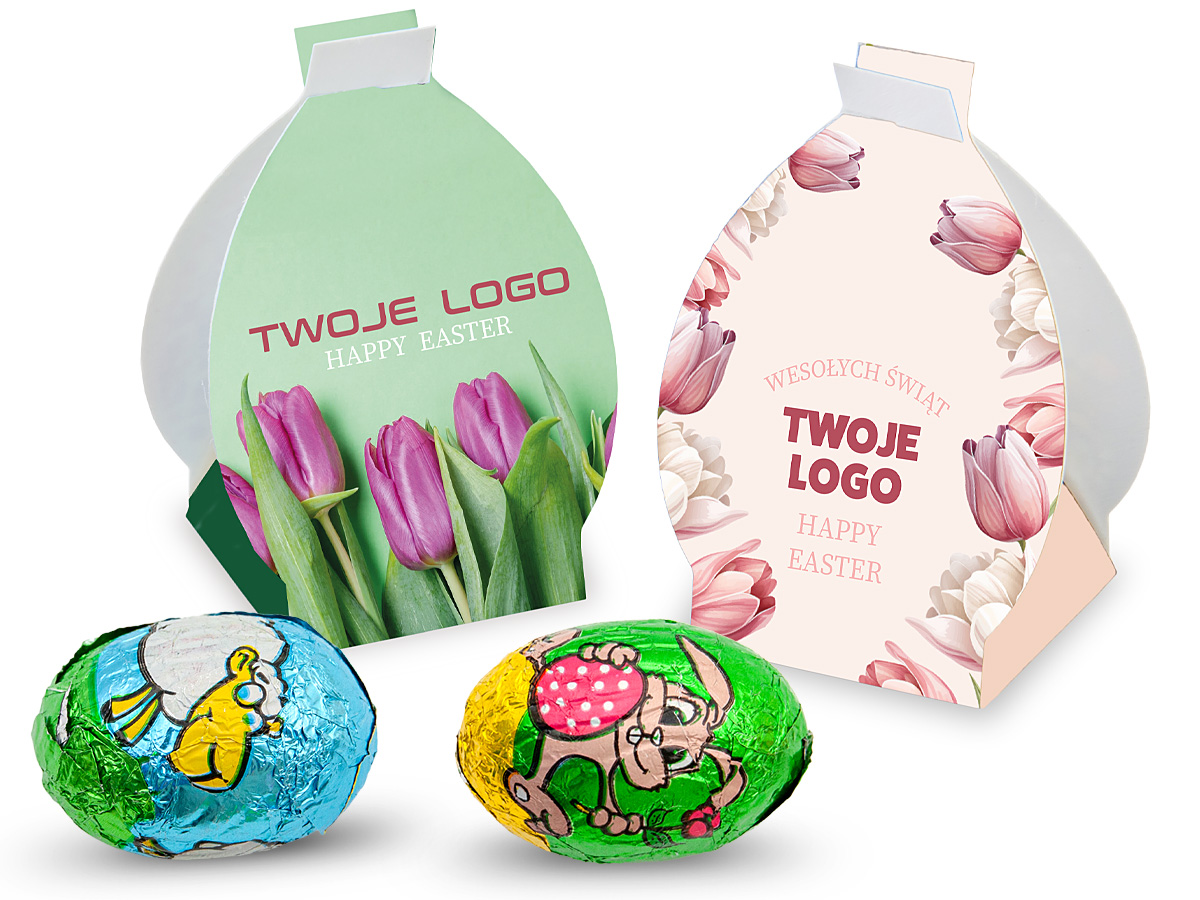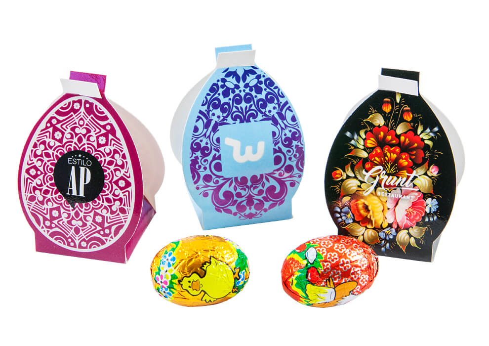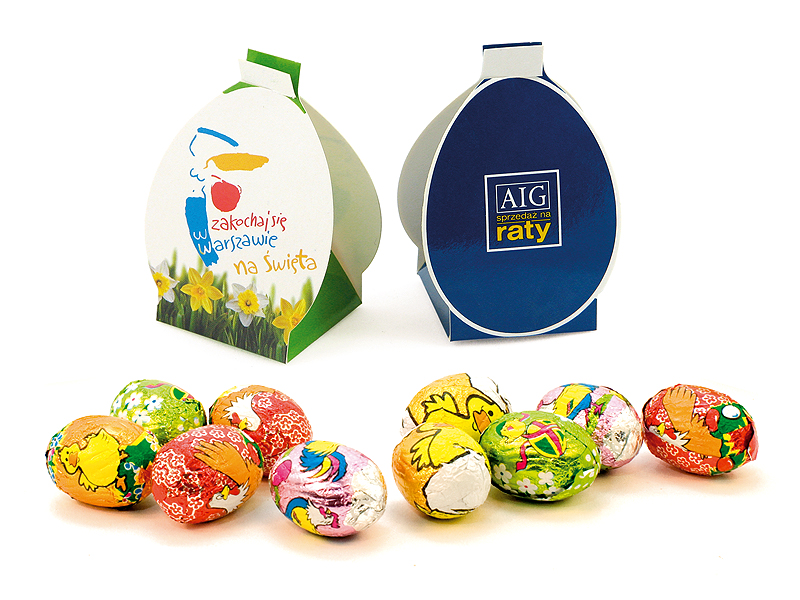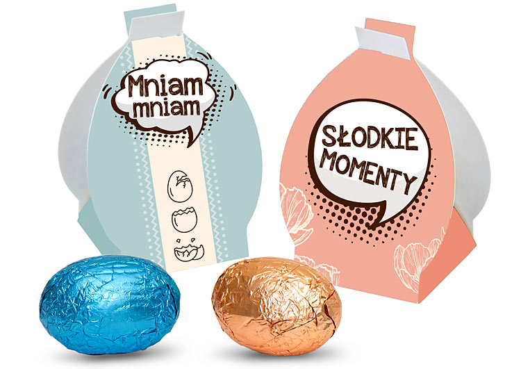 • czekoladowe jajeczka pakowane pojedynczo w kartonowe pudełeczka w kształcie jajka