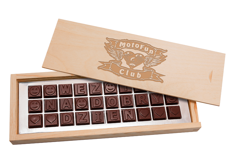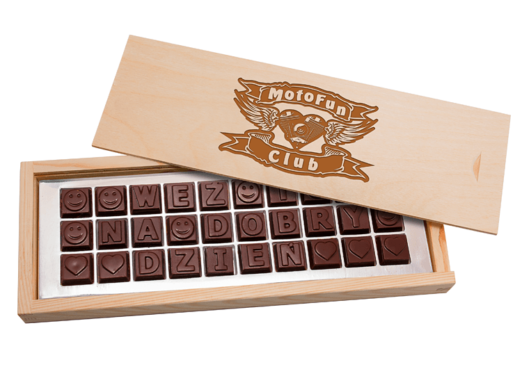 • wyjątkowa czekoladowa wiadomość – elegancki, personalizowany prezent w naturalnym drewnianym opakowaniu