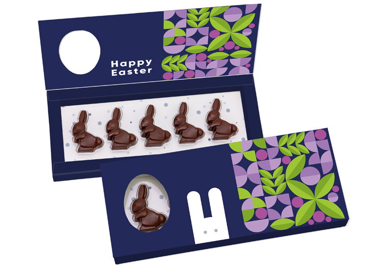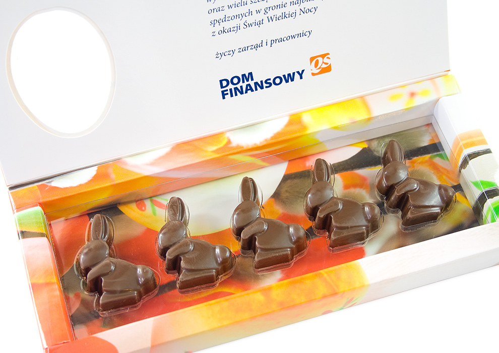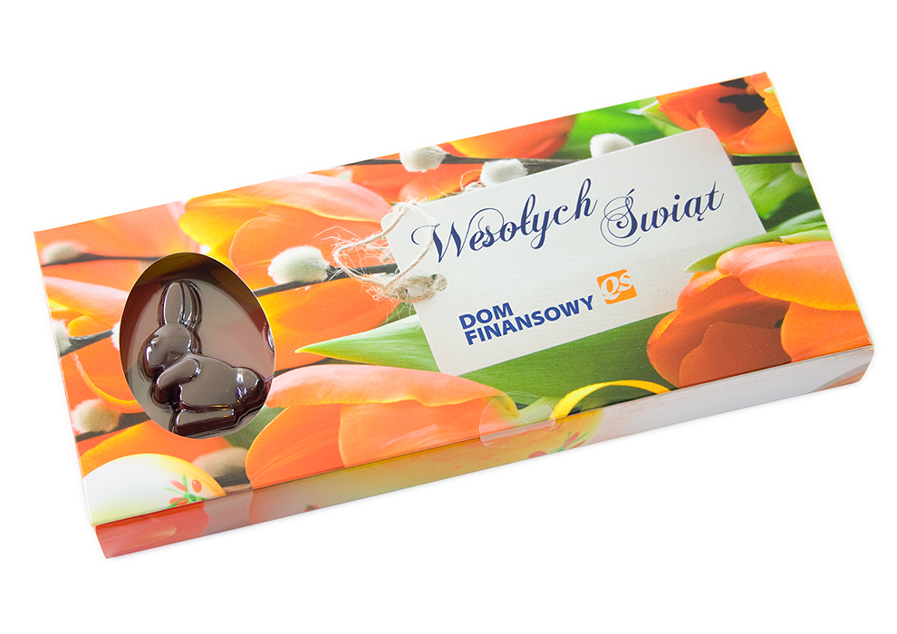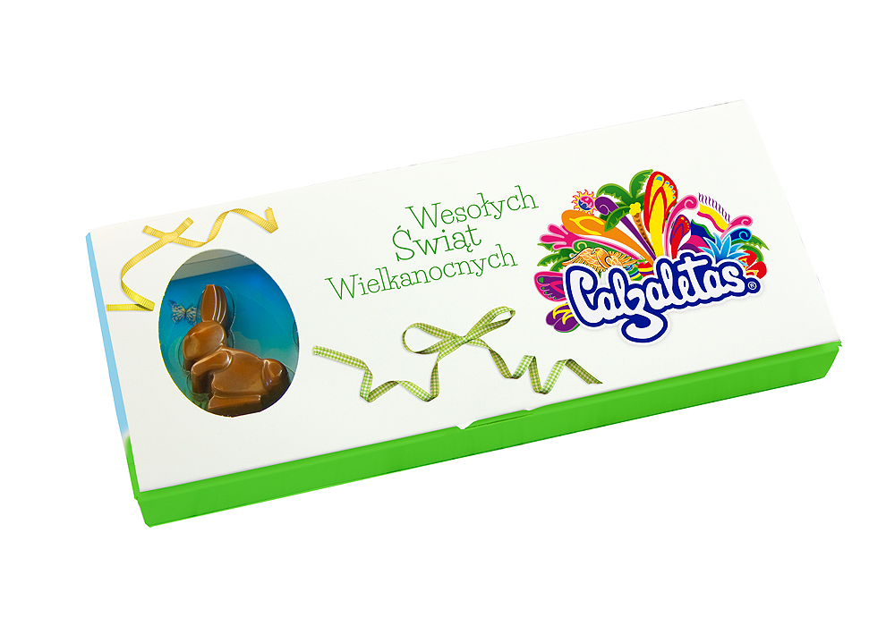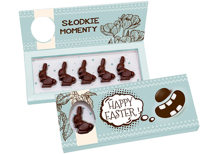- opakowanie katronowe z klapą oraz okienkiem w kształcie jajka przez które widać jednego zajączka