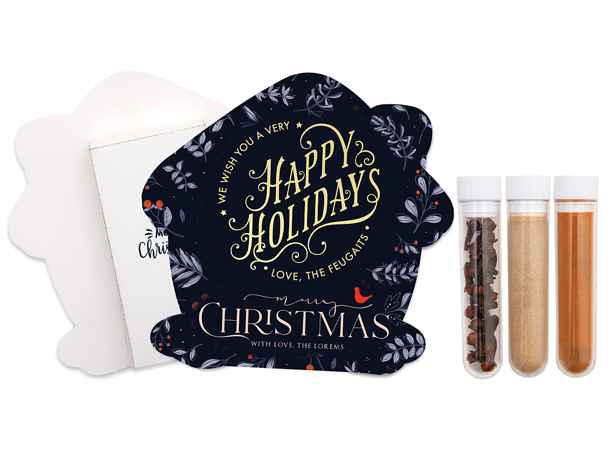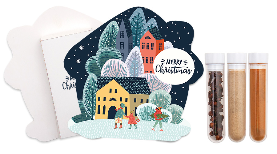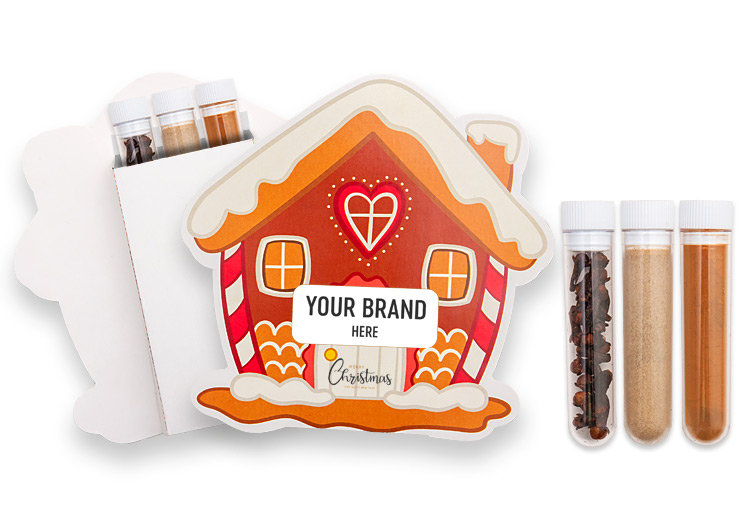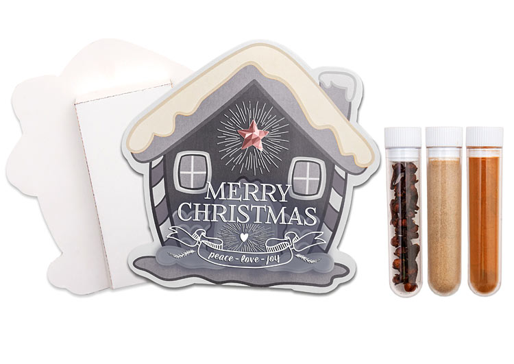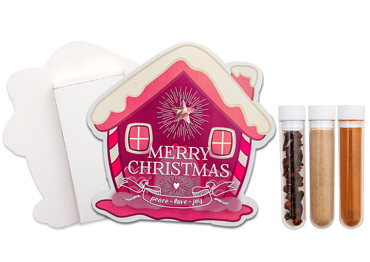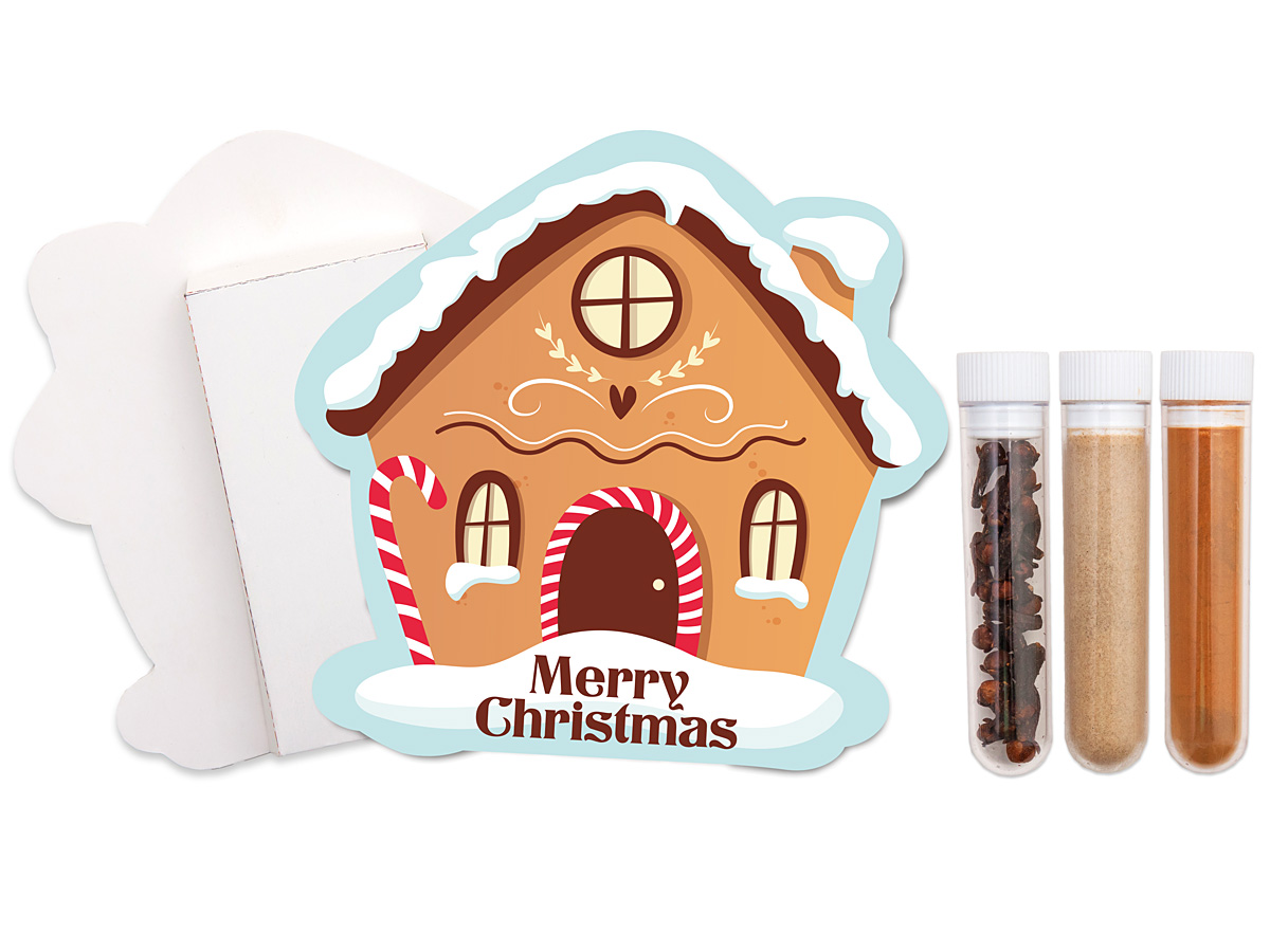 • piernikowy domek z trzema fiolkami wypełnionymi aromatycznymi przyprawami świątecznymi