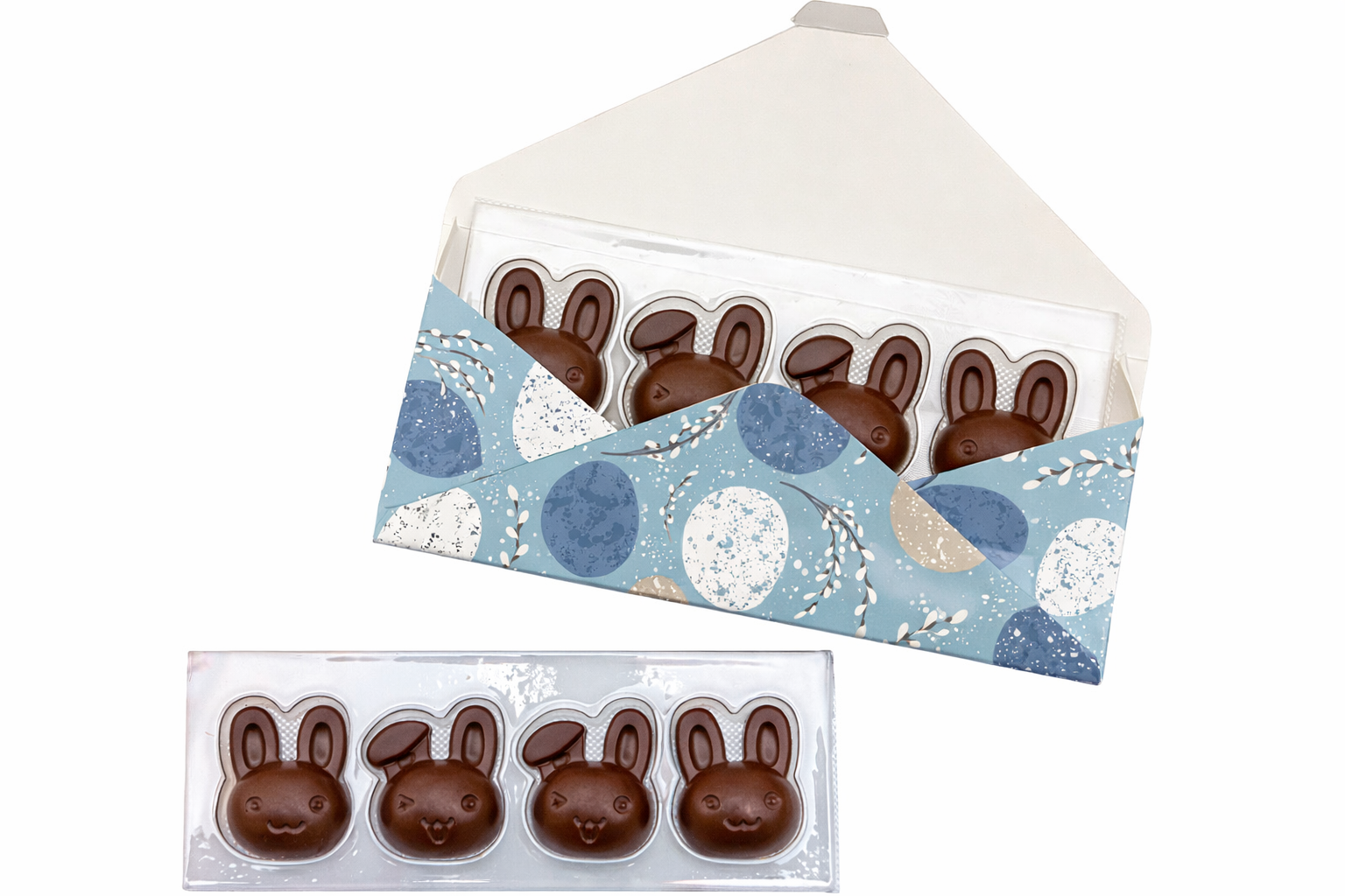 Uroczy mini zestaw na Wielkanoc składający się z czterech czekoladowych zajączków