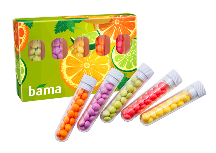 • orzeźwiające drażetki owocowe pakowane w przezroczyste fiolki i opakowania kartonowe