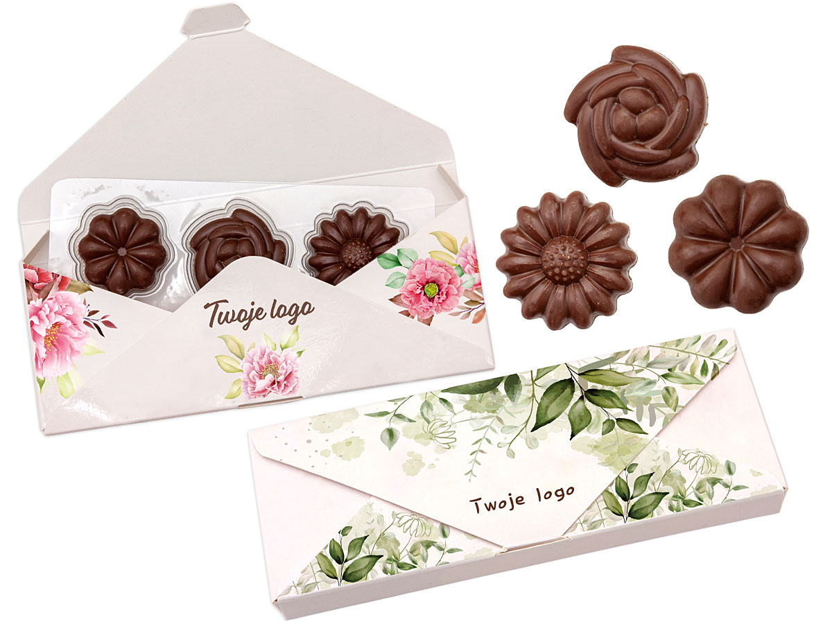 Uroczy mini zestaw składający się z trzech czekoladek w kształcie kwiatków