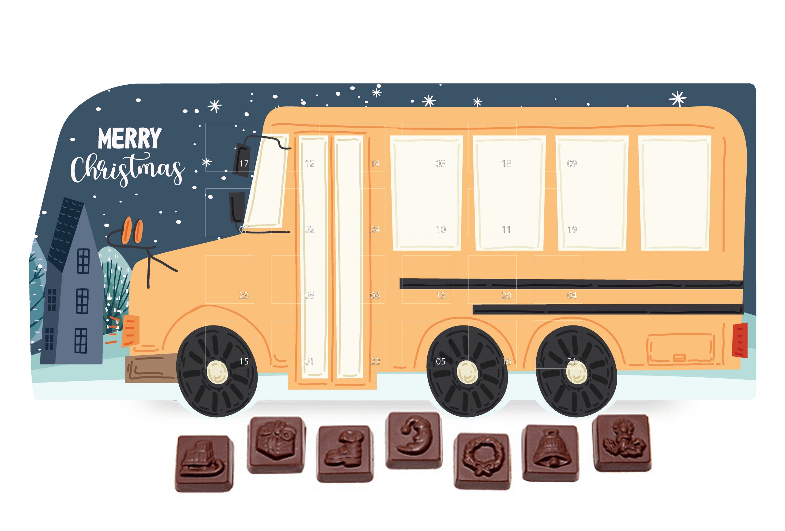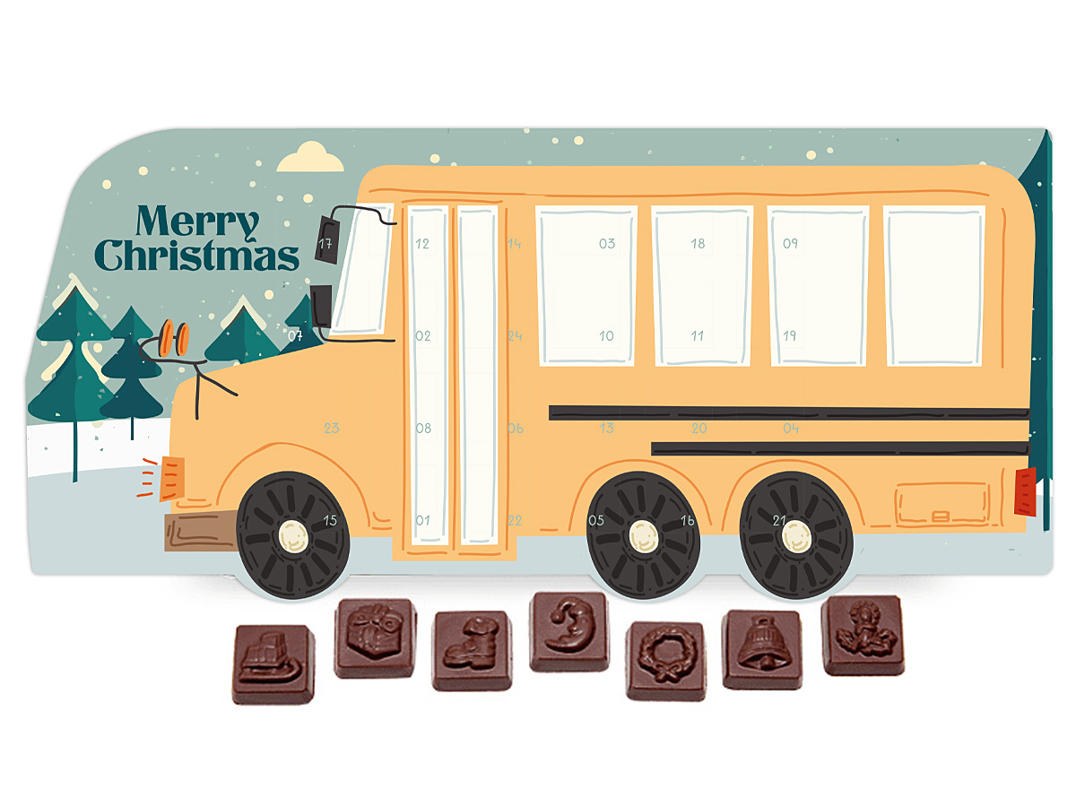 • kalendarz adwentowy w kształcie autokaru z 24 prostokątnymi czekoladkami z wytłoczonymi motywami świątecznymi