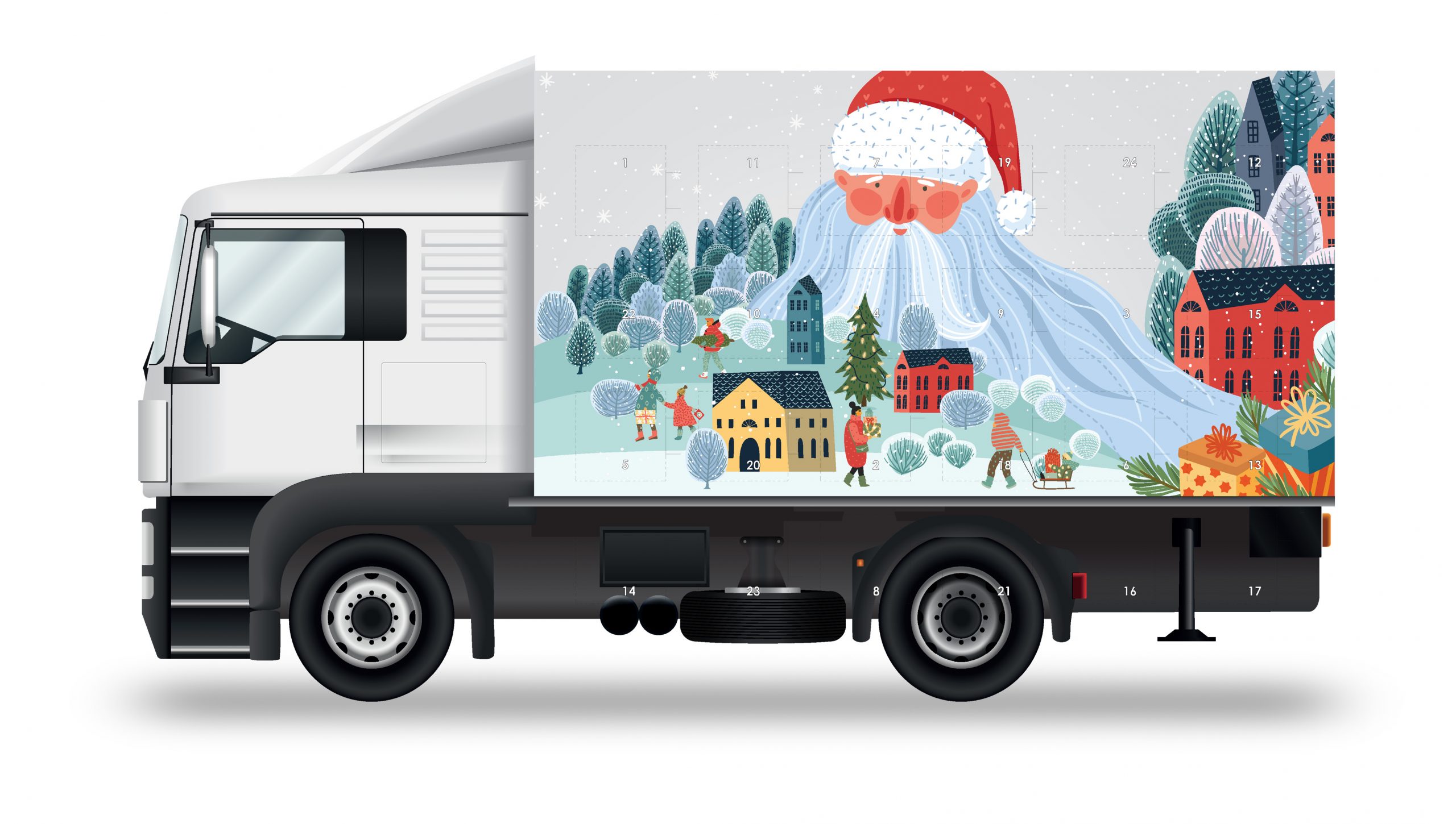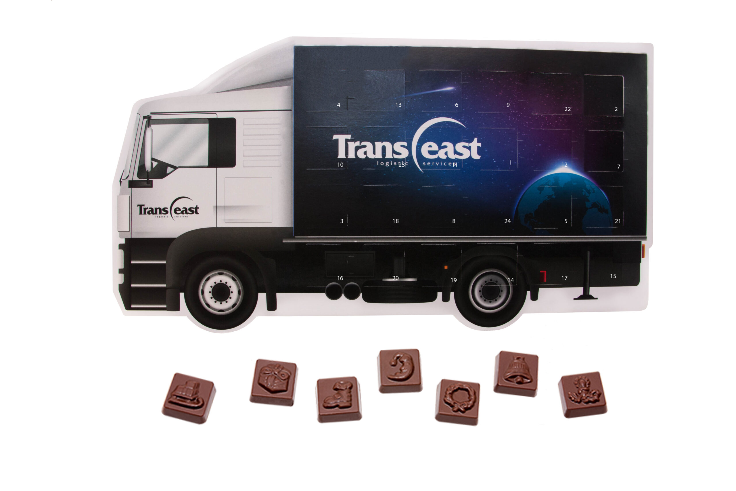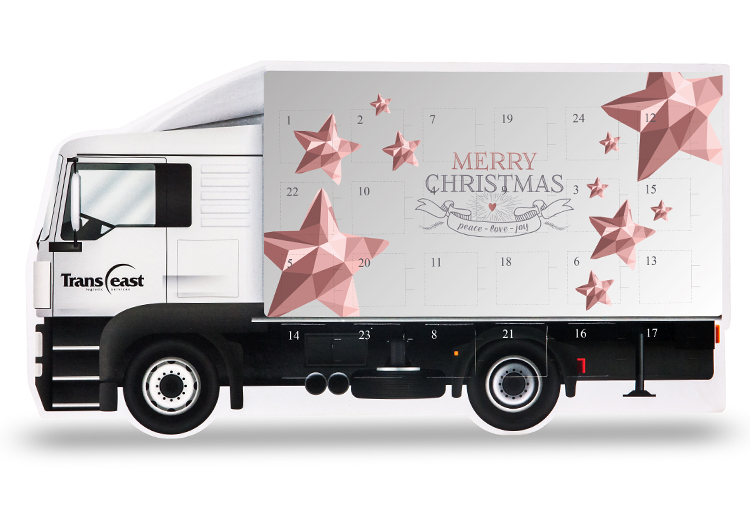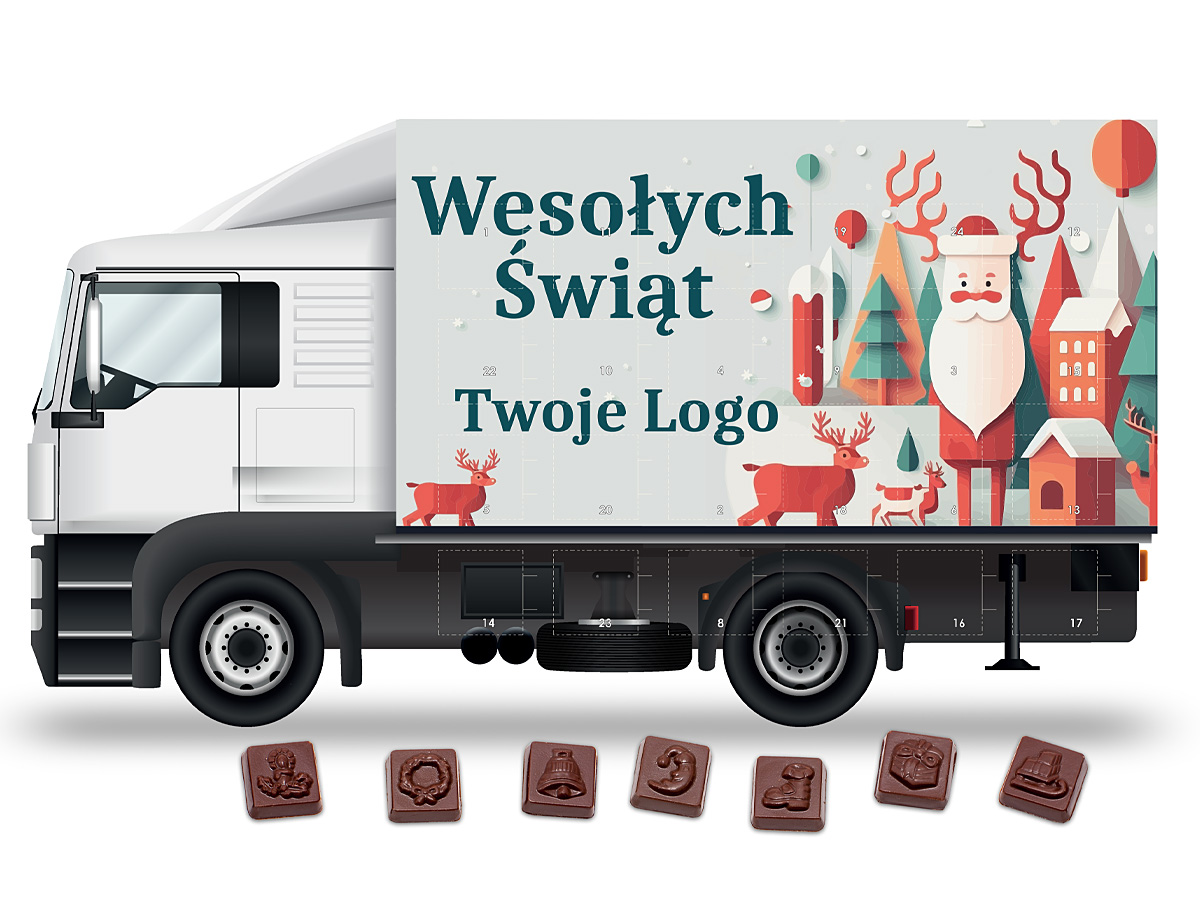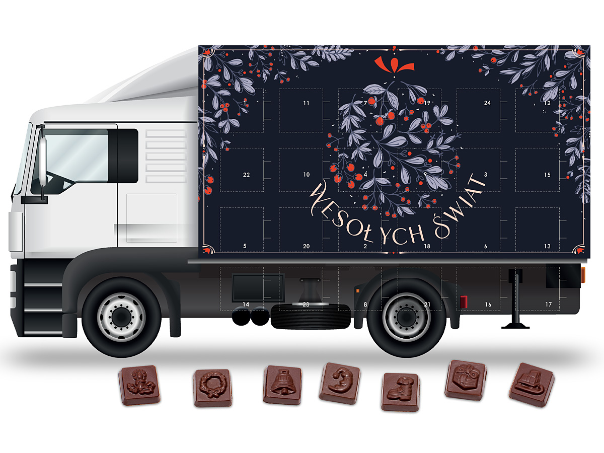 • kalendarz adwentowy w kształcie samochodu ciężarowego z 24 prostokątnymi czekoladkami z wytłoczonymi motywami świątecznymi