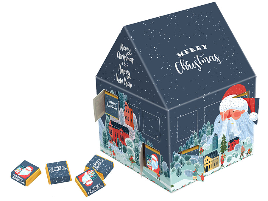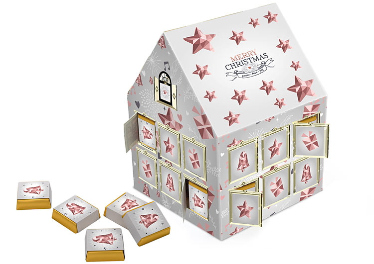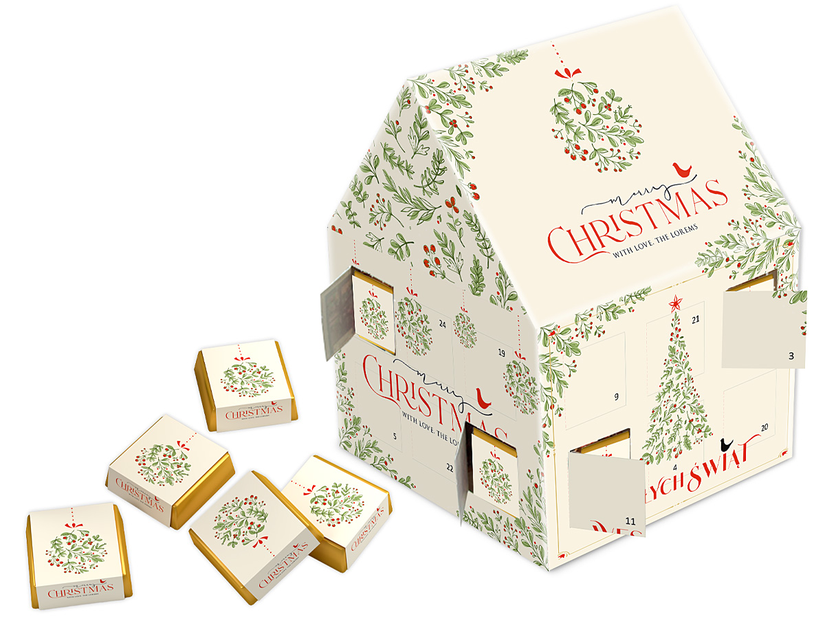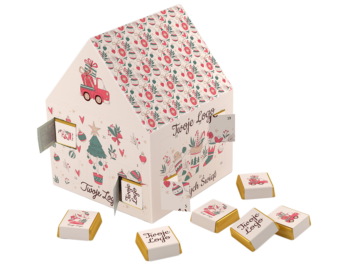 • duży kalendarz adwentowy w kształcie domku, zawierający 24 markowe czekoladki z delikatnie alkoholizowanym nadzieniem