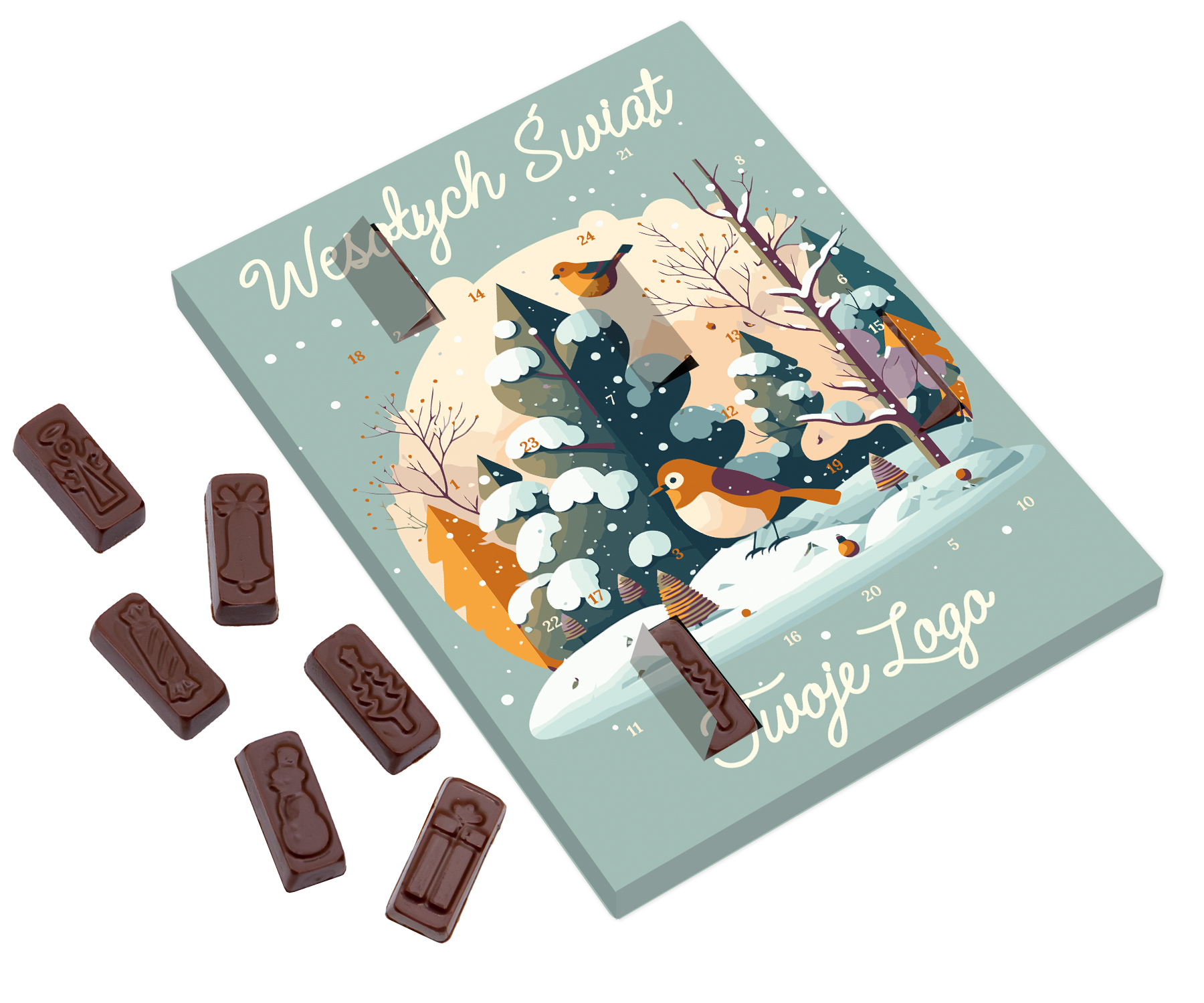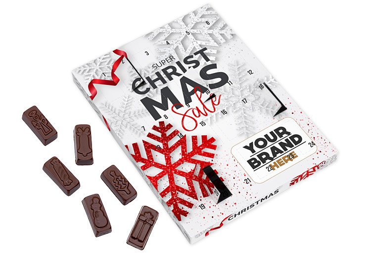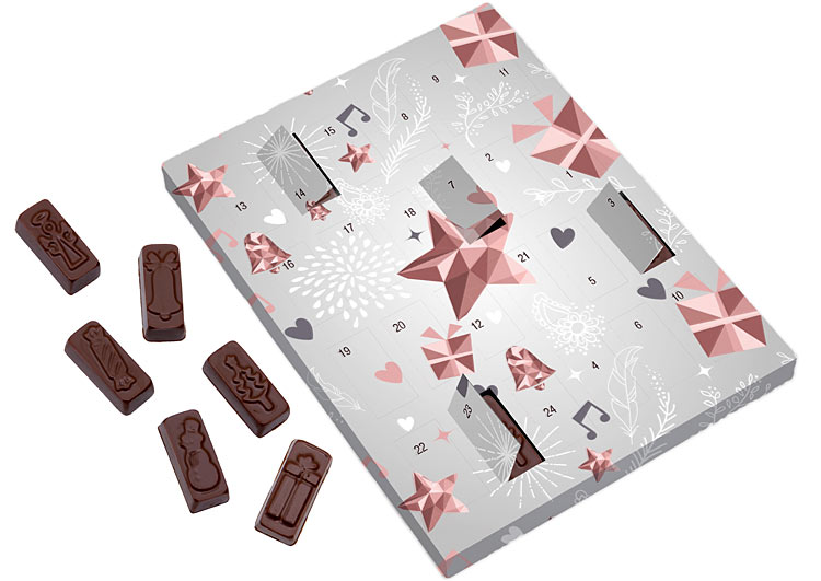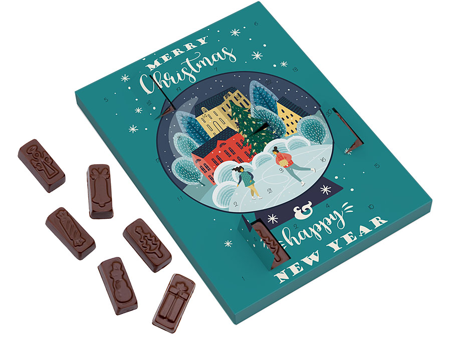 • niewielki kalendarz adwentowy z 24 prostokątnymi czekoladkami z wytłoczonymi świątecznymi motywami