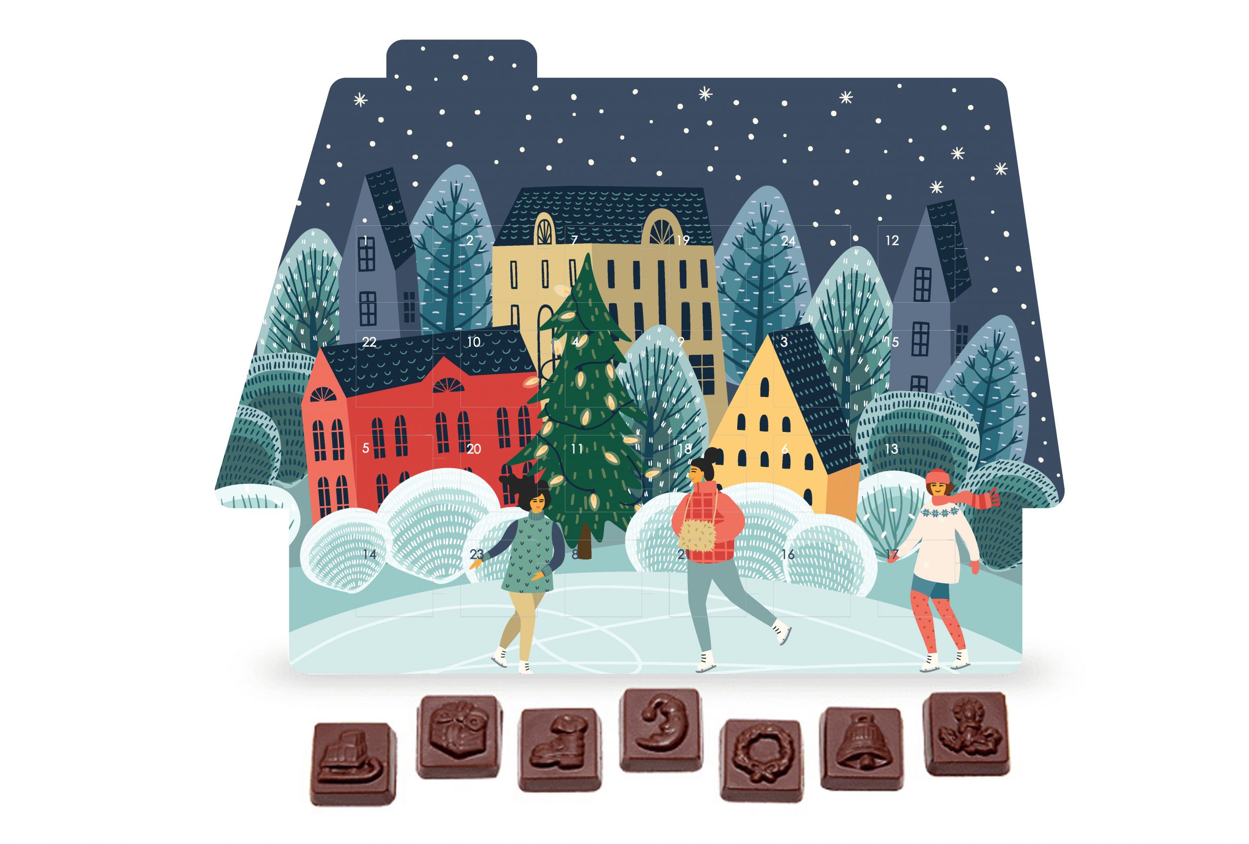 • kartonowe opakowanie w formie domku z ponumerowanymi okienkami do wyjmowania czekoladek