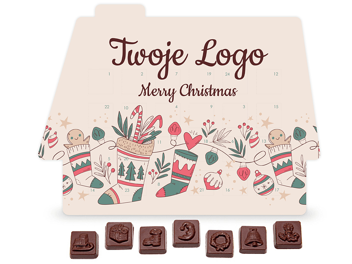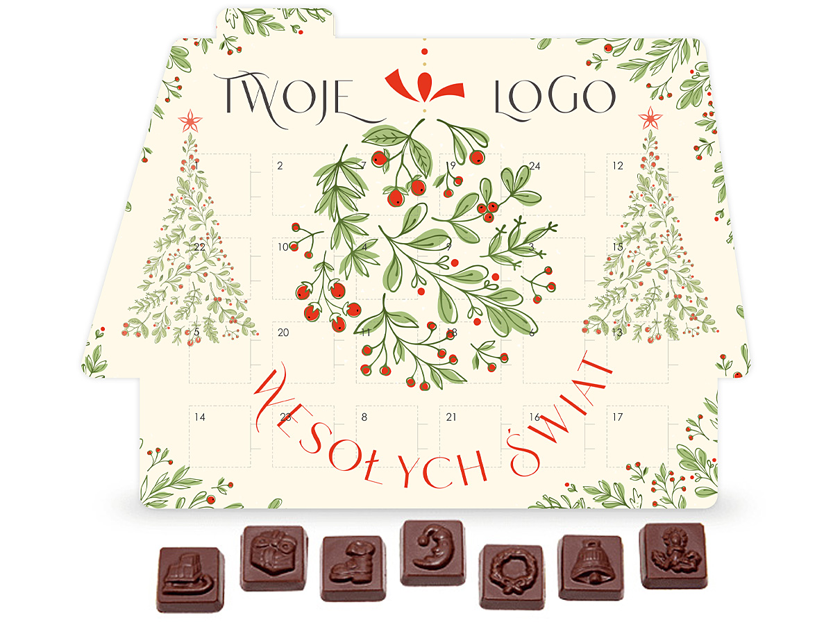 • kalendarz adwentowy w kształcie domku z piernika zawierający 24 prostokątne czekoladki z wytłoczonymi świątecznymi motywami
