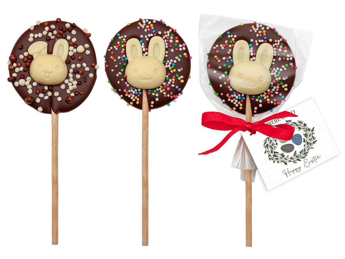 - okrągły lizak czekoladowy z zatopionym czekoladowym zajączkiem i dekoracyjną posypką