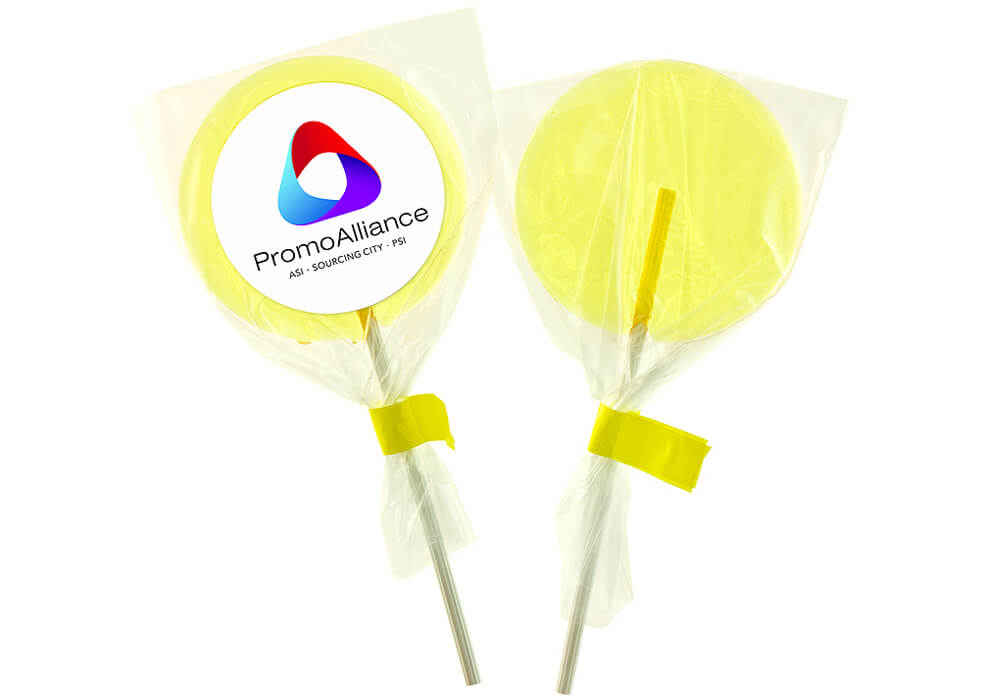 Okrągłe lizaki owocowe o średnicy 80 mm o różnych kolorach i smakach.