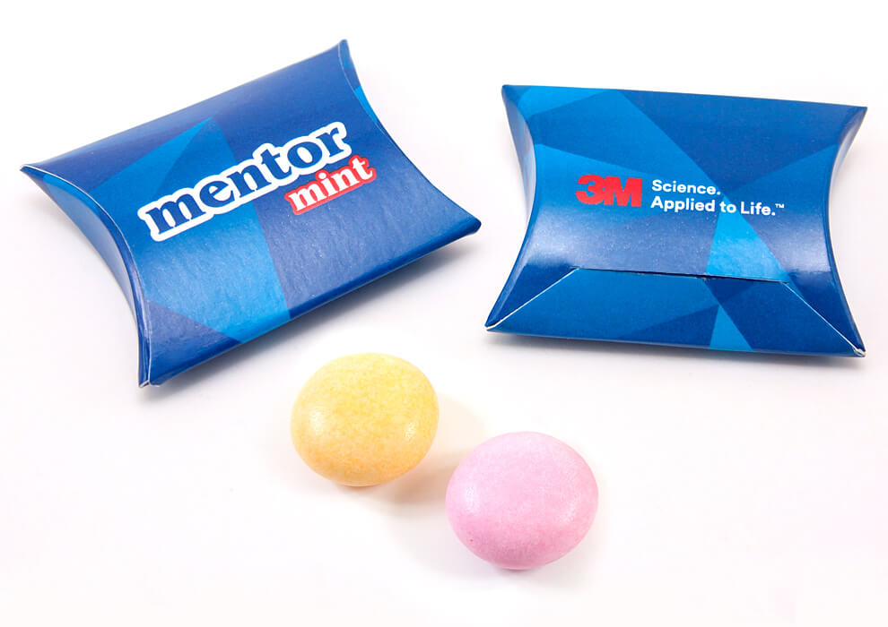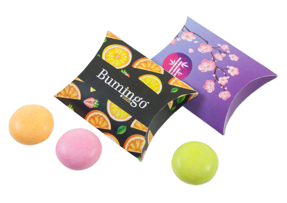 - pudełeczko kartonowe w kształce poduszki z dowolnym nadrukiem reklamowym CMYK lub do 4 kolorów Pantone