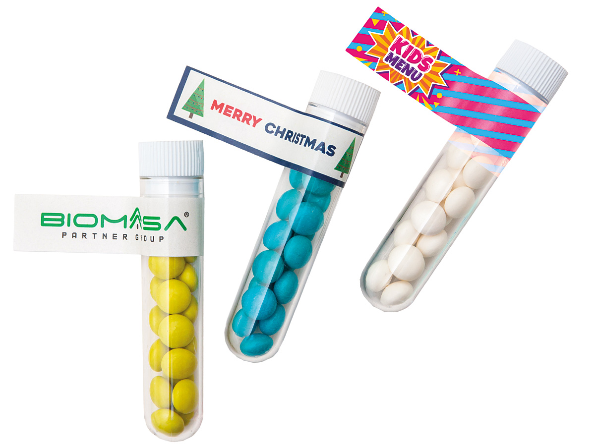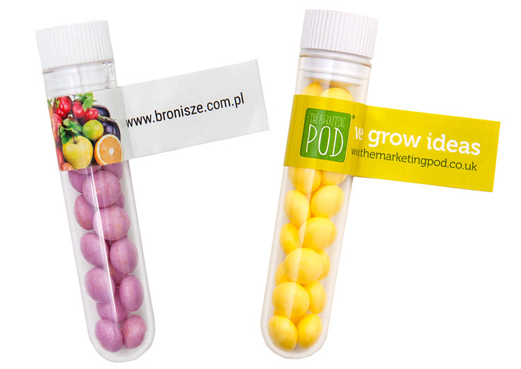 • orzeźwiające drażetki owocowe pakowane w przezroczystą fiolkę z chorągiewką reklamową