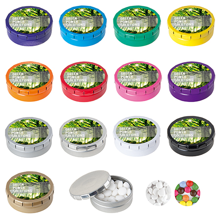 • kompaktowe, okrągłe pudełka metalowe w kilkunastu kolorach do wyboru: granatowy, niebieski, ciemnozielony, żółty, pomarańczowy, czerwony, fioletowy, różowy, szary, srebrny, biały, czarny, złoty