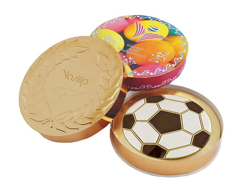 • opcjonalnie możliwość wytłoczenia prostego logotypu na centralnym elemencie piłki z ciemnej czekolady