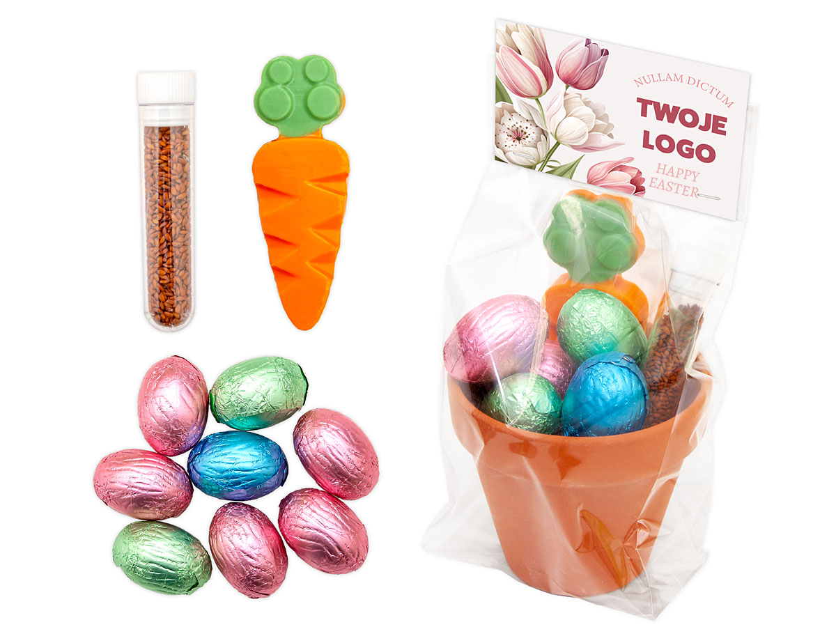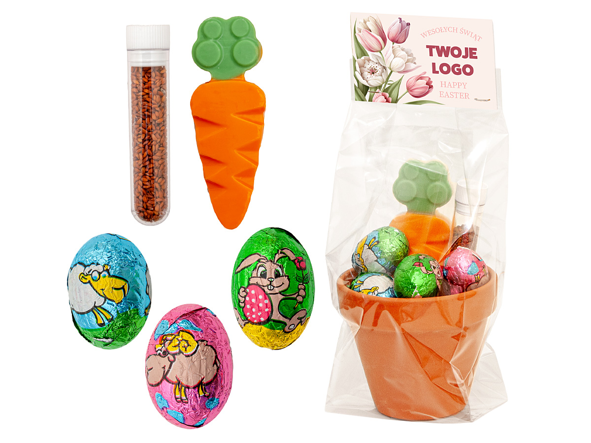 • zawartość: 8 czekoladowych jajeczek w mixie smaków (90g), czekoladowa marchewka – spód wykonany z czekolady białej, wierzch z czekolady pomarańczowej (25g), fiolka z nasionami rzeżuchy (4g), wata, doniczka