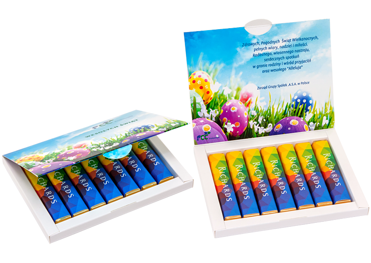 • zawinięte w złoty laminat z kolorowym końcem (kolor zależny od smaku) i obwoluty z dowolnym nadrukiem reklamowym CMYK na całej powierzchni opakowania