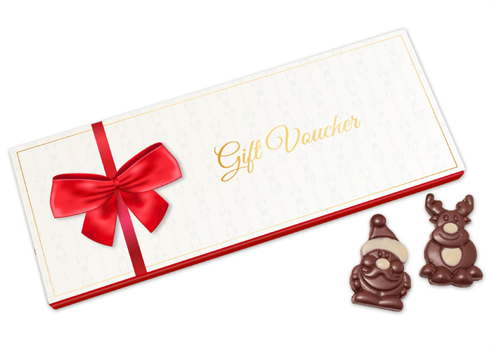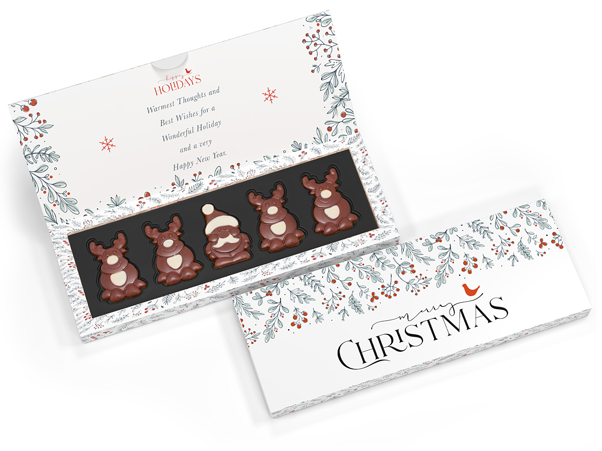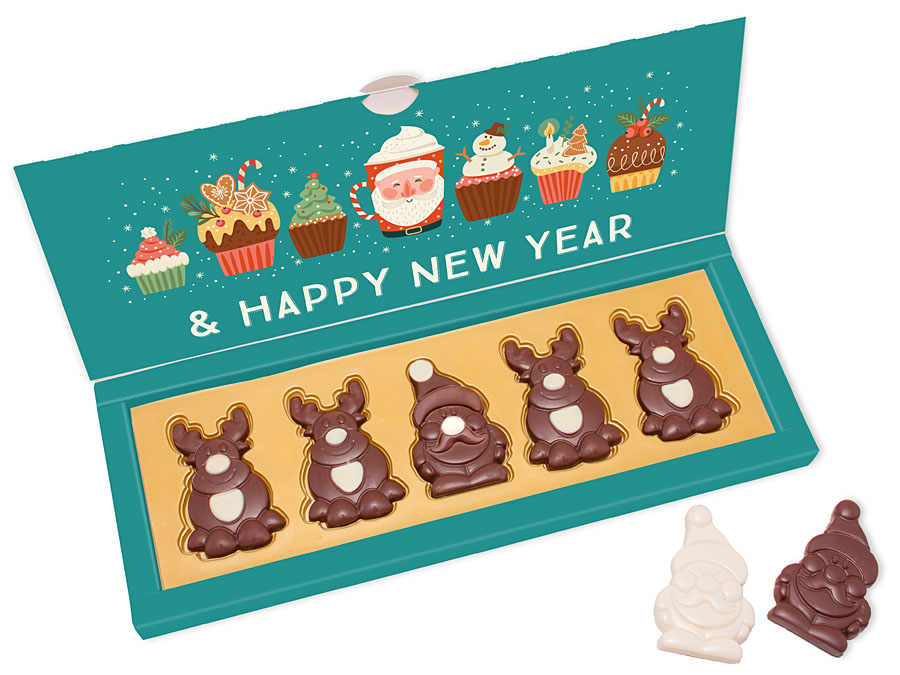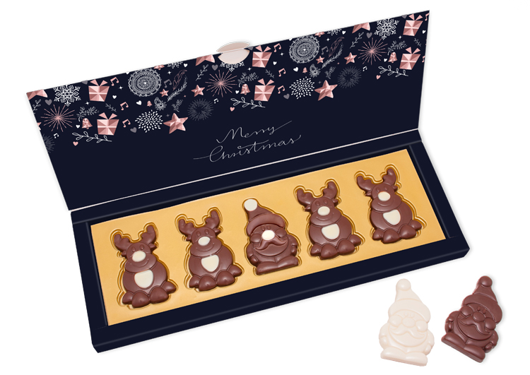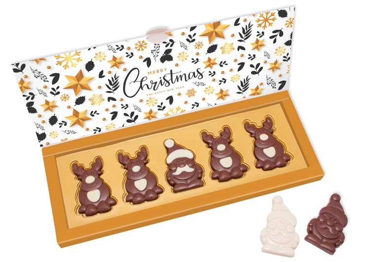 • w zestawie 1 czekoladka w kształcie Mikołaja oraz 4 czekoladki w kształcie reniferów