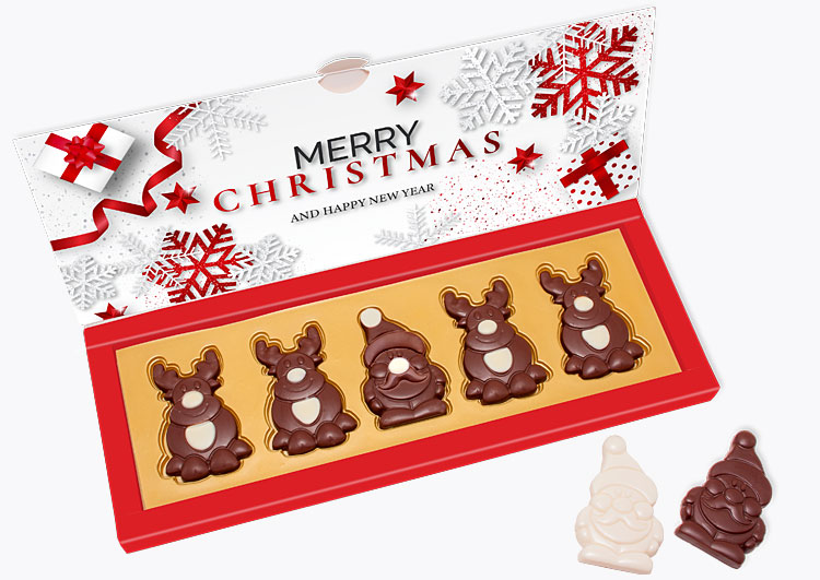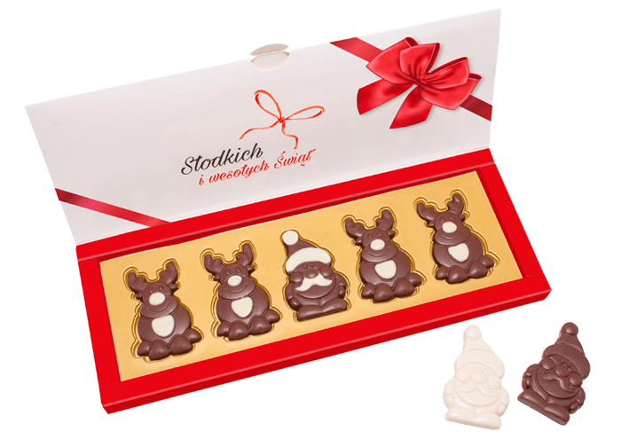 • bożonarodzeniowy zestaw czekoladek w kształcie Świętego Mikołaja i jego reniferów