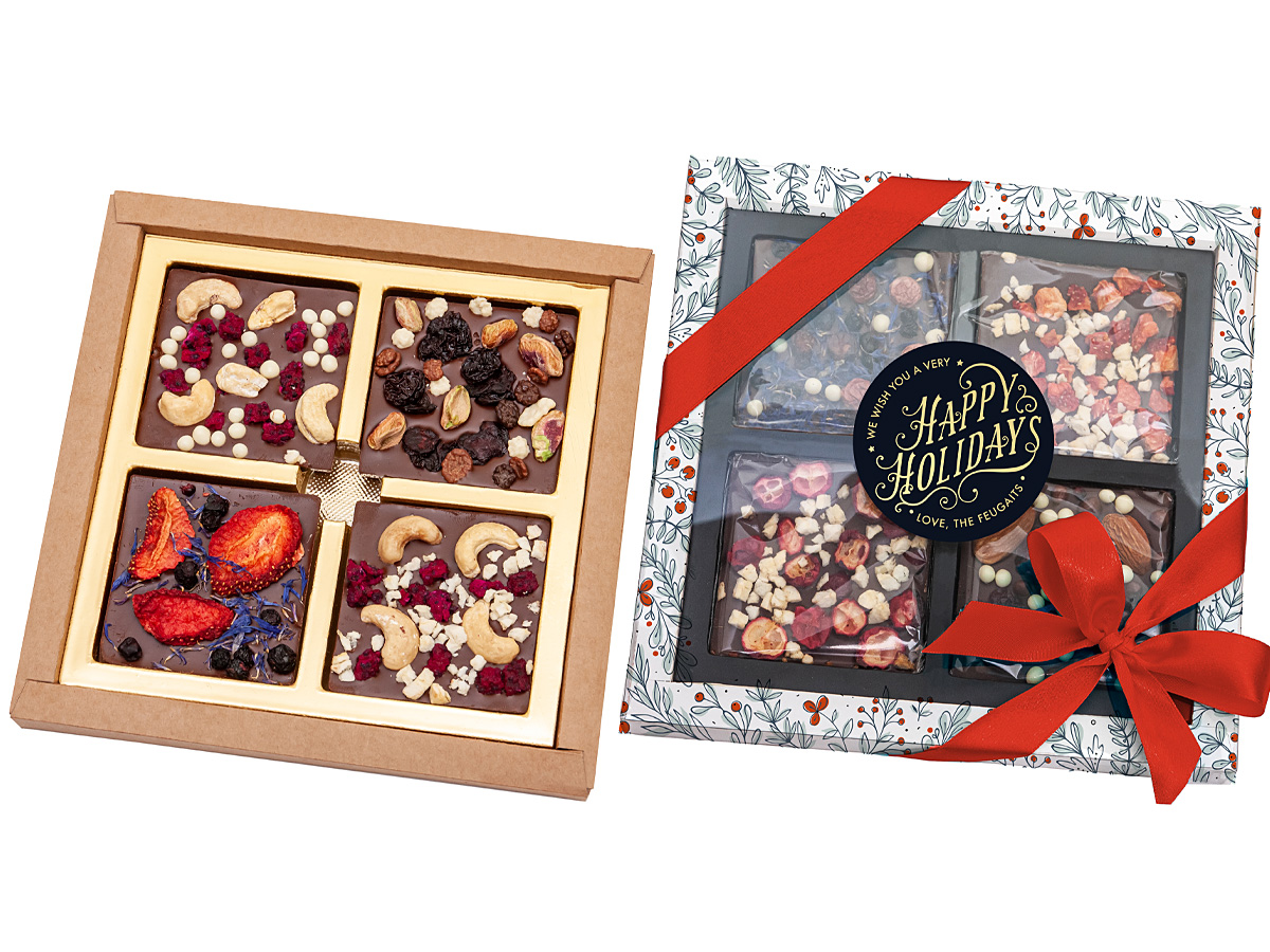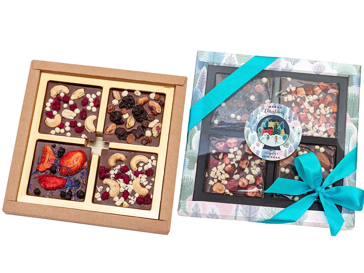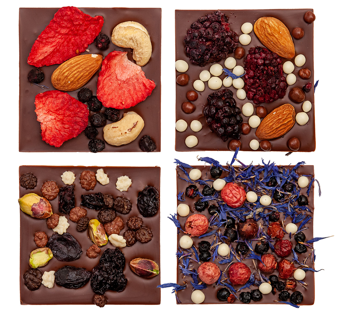 4 wyśmienite czekoladki wykonane z czekolady mlecznej 44% ozdobione różnymi owocami liofilizowanymi, posypkami czekoladowymi i orzechami