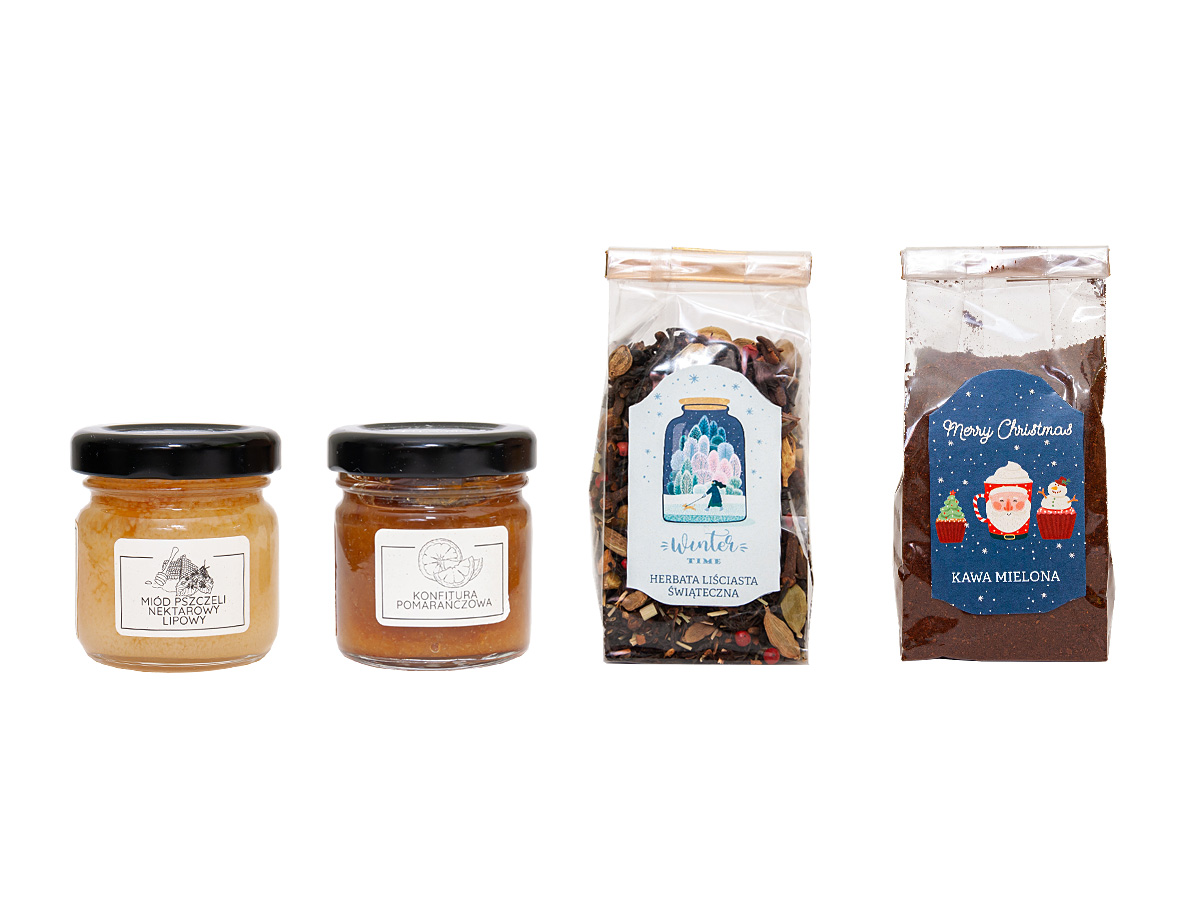 • na opakowaniach herbaty i kawy etykietki samoprzylepne z dowolnym nadrukiem reklamowym CMYK