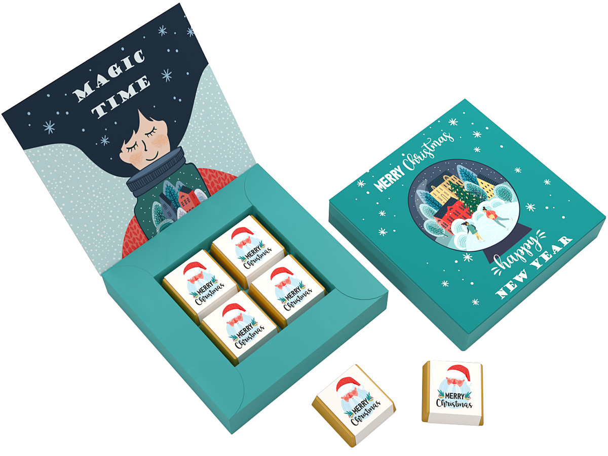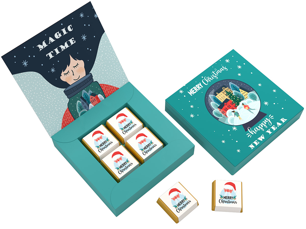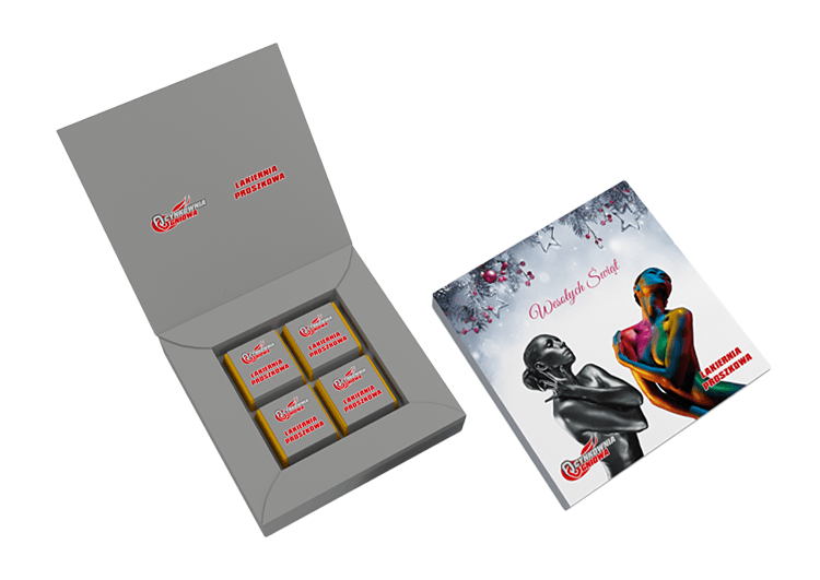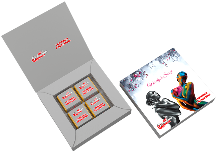 • każda czekoladka zawinięta w złoty laminat i obwolutę z dowolnym nadrukiem reklamowym CMYK na całej powierzchni opakowania