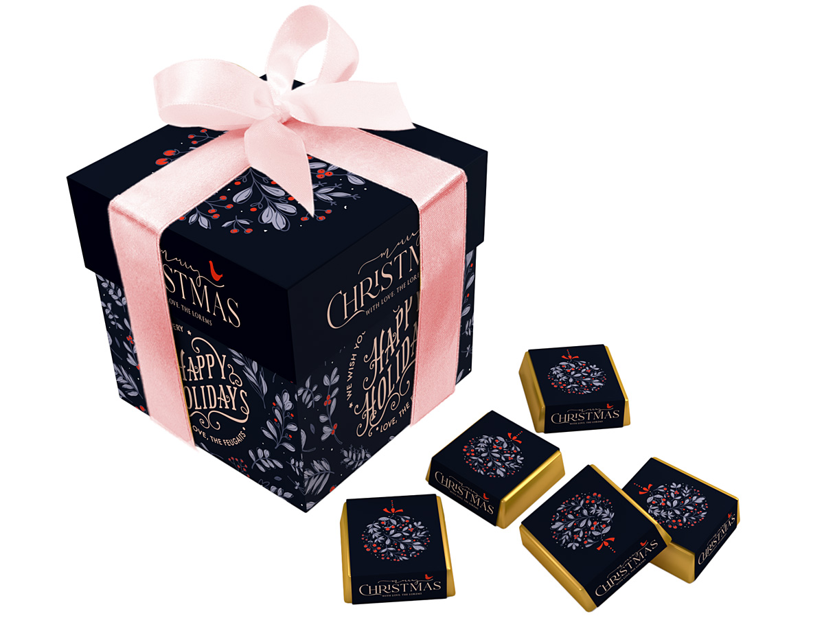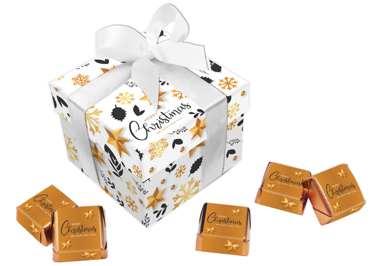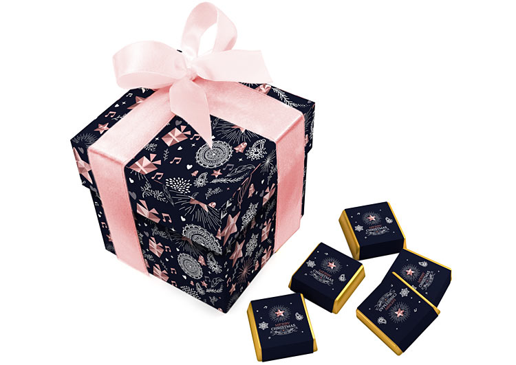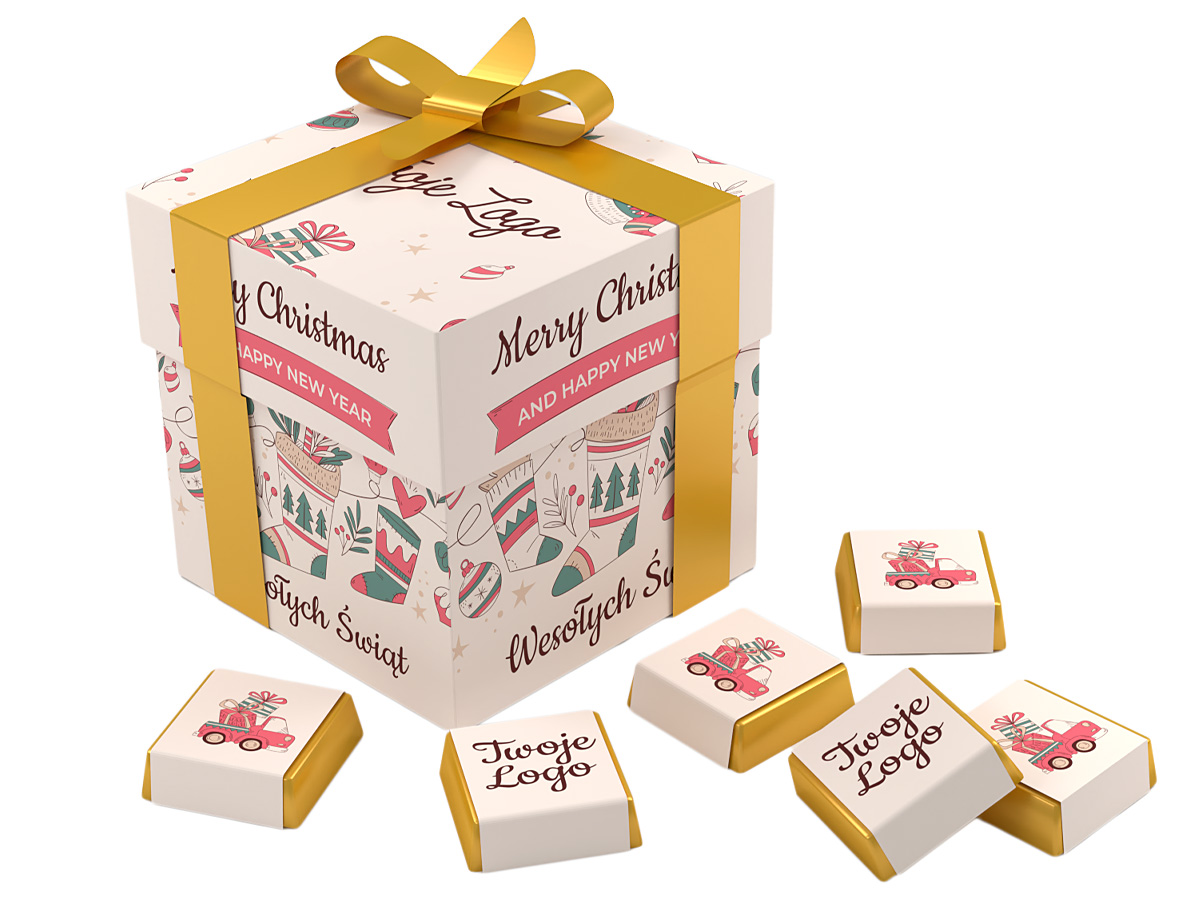 • każda czekoladka zawinięta w złoty laminat i obwolutę z dowolnym nadrukiem reklamowym CMYK na całej powierzchni opakowania