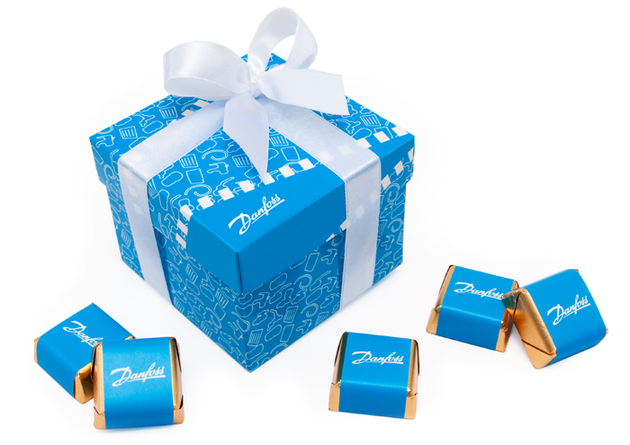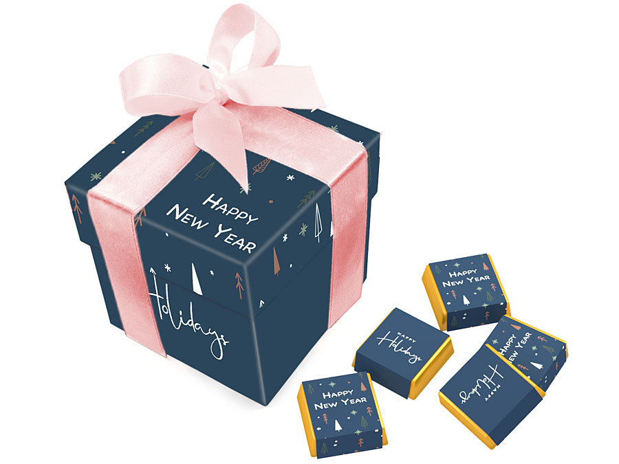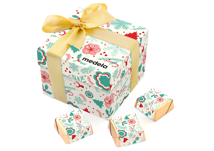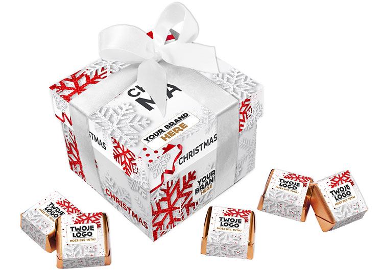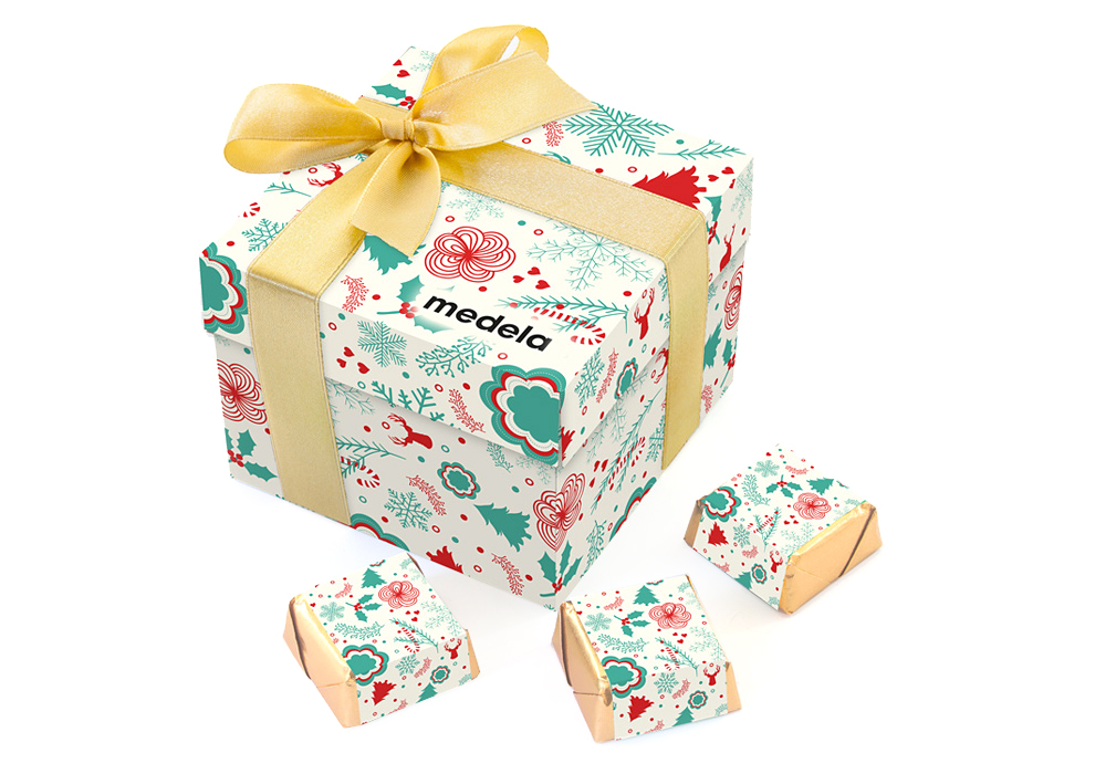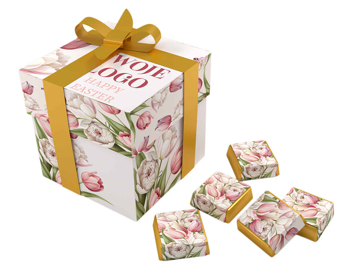 • każda czekoladka zawinięta w złoty laminat i obwolutę z dowolnym nadrukiem reklamowym CMYK na całej powierzchni opakowania
