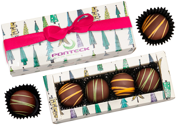 • każda pralina zdobiona finezyjnymi paskami z czekolady o kontrastujących kolorach